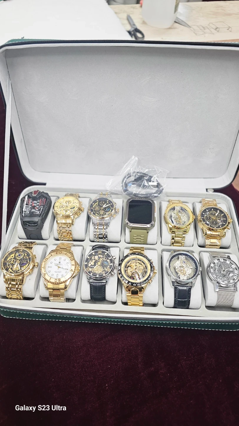 This set includes eleven watches in a dark green, zippered display case. The watches are a mix of gold-tone, silver-tone, and black with various dial designs and strap materials, including metal bands and leather bands. One smartwatch with a green band and a charging cable are also included.
