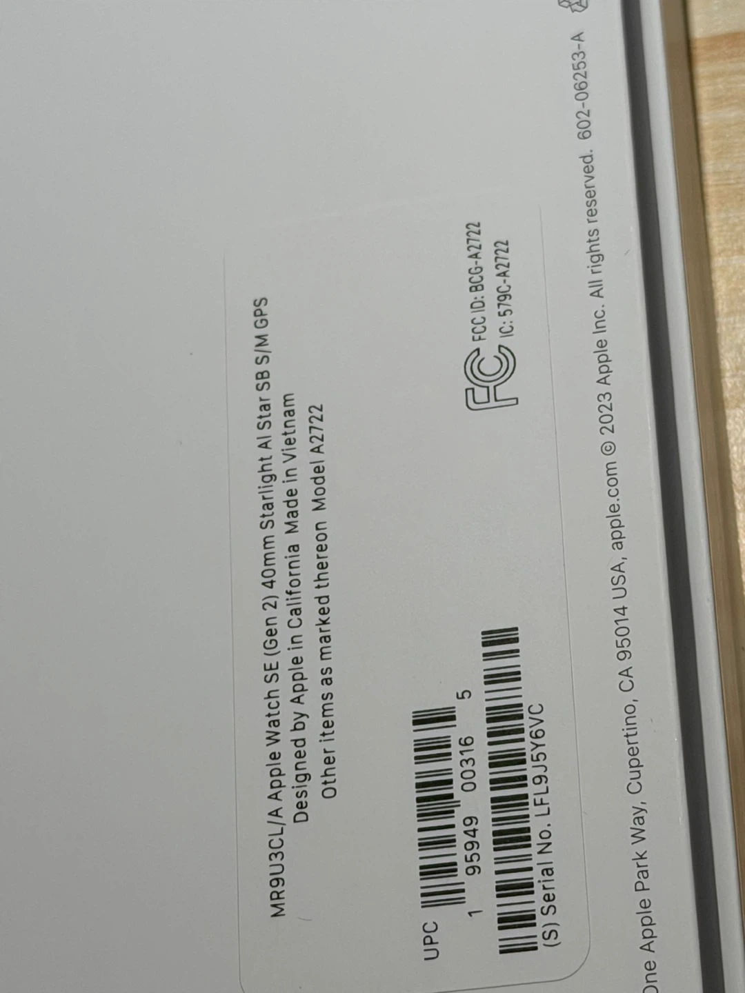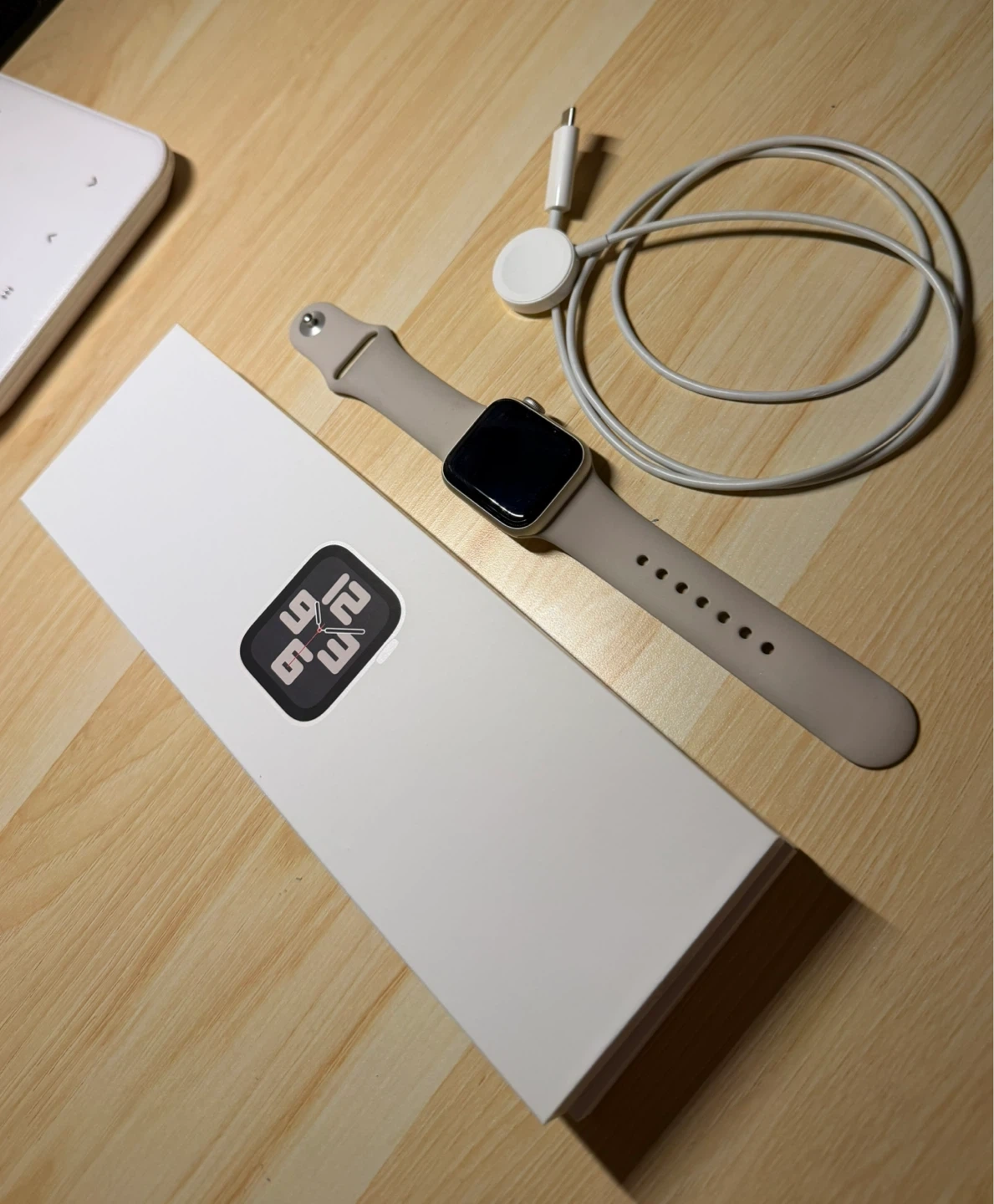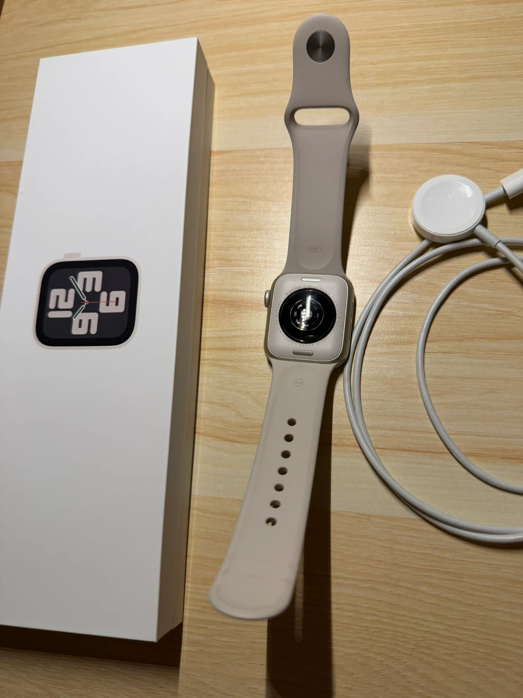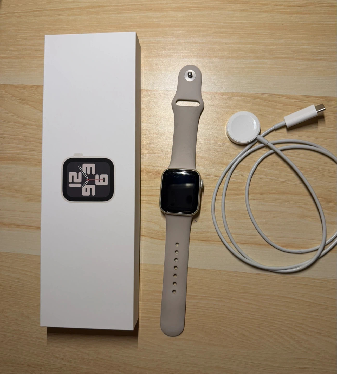 Selling an Apple Watch SE (Gen 2) in Starlight colour. It's the 40mm GPS model. Includes the watch, a charging cable, and original box. Designed by Apple in California, made in Vietnam.