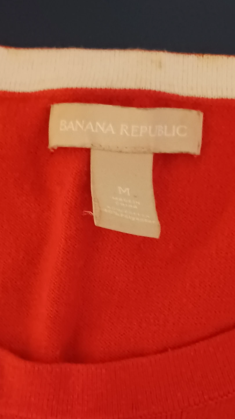 Banana Republic women's sweater in a vibrant red hue. It features 3/4 length sleeves and0000000009 white cuffs and collar detail. Size medium. Material is 40%cotton and 60% acrylic. Never worn! Karrot suggests $10 - $15