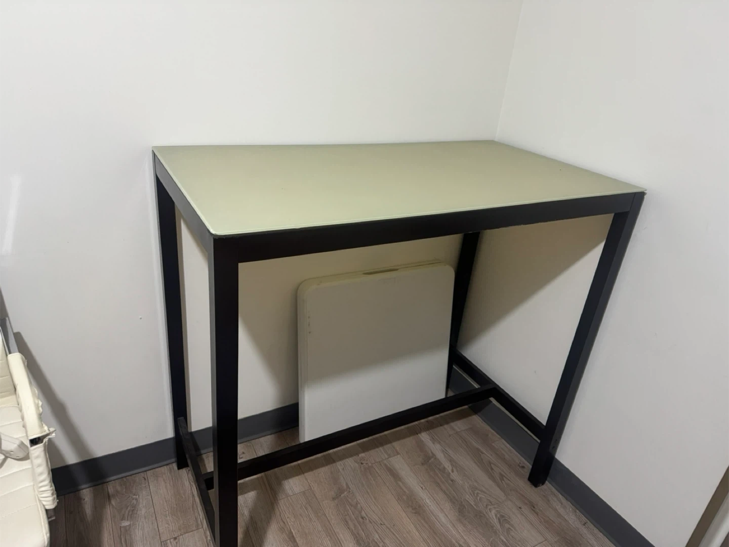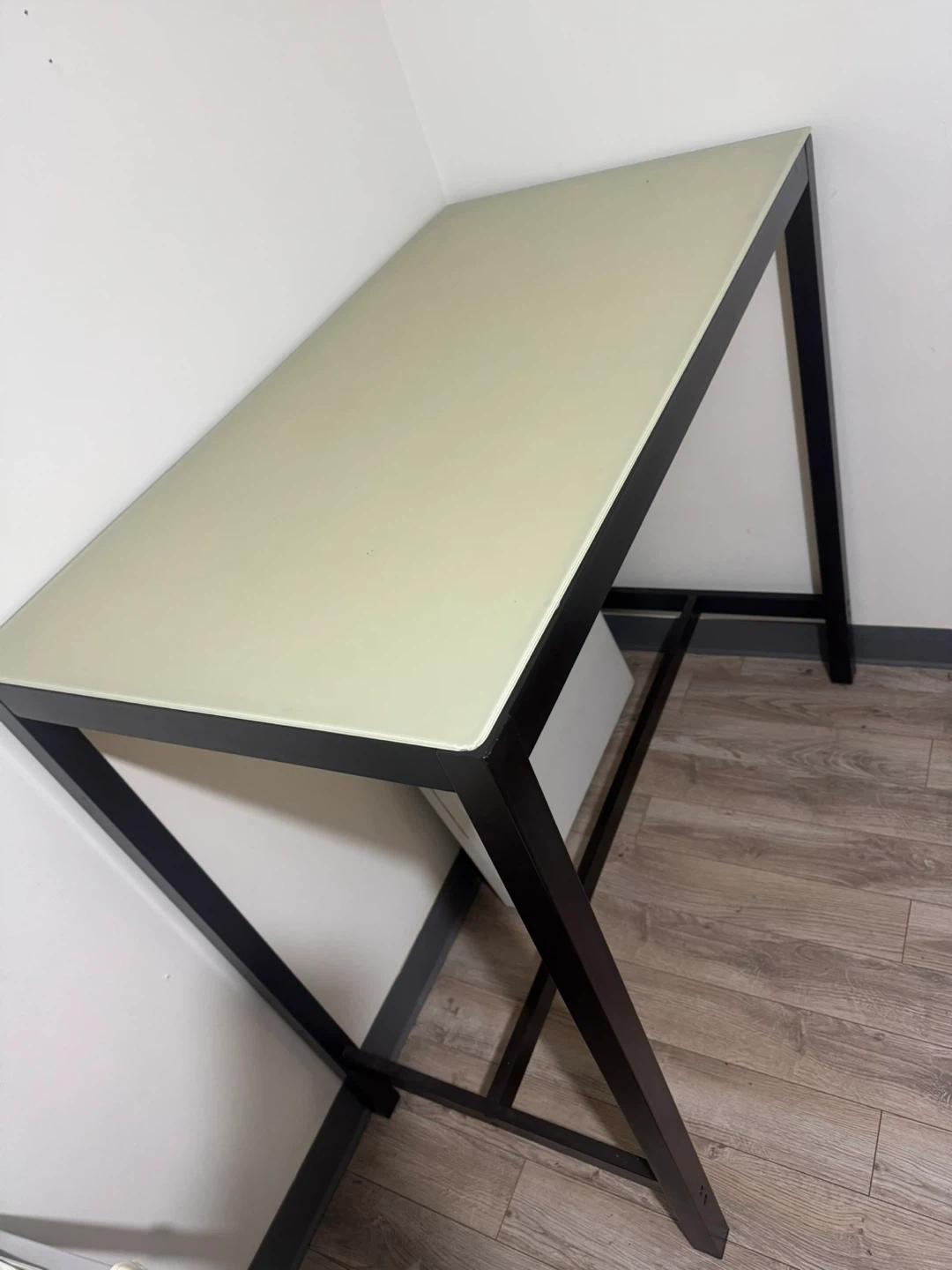 Selling a modern desk with a sleek black frame and a light-colored top! It's in great condition and would be perfect for a home office or study space. The simple design makes it easy to match with any decor. It's sturdy and ready for a new home