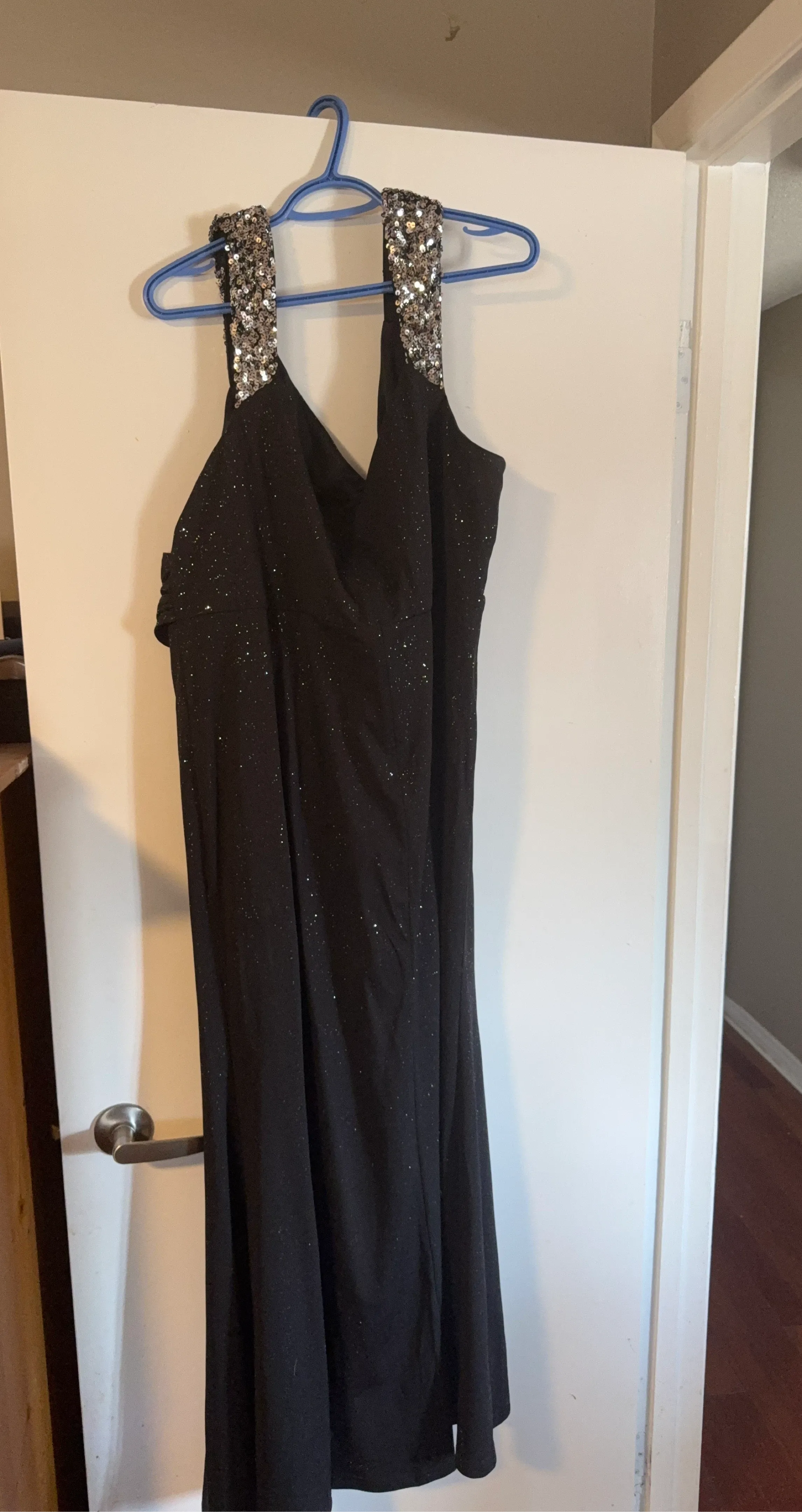 A black, floor-length dress with a subtle sparkle throughout the fabric. It features eye-catching sequined detailing on the shoulders. Perfect for evening wear or special occasions!