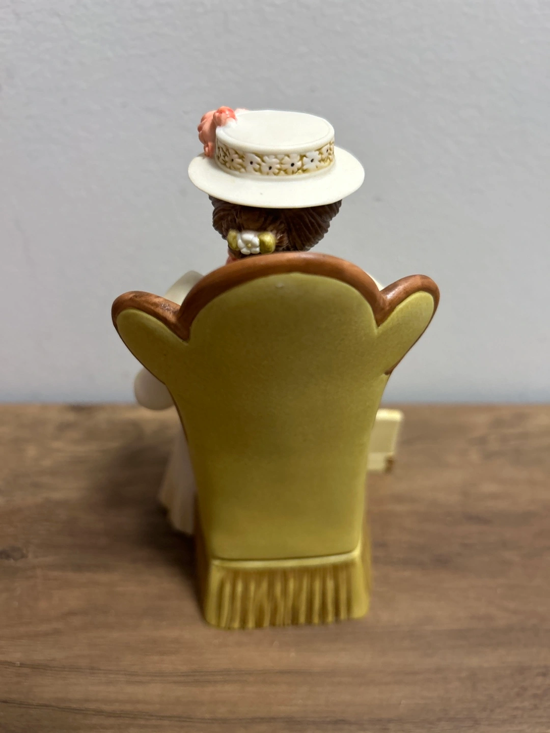 This is an AVON President's Club award figurine from 2011-2012. It depicts a woman sitting in a chair with a makeup case and perfume bottles. The figurine is made of ceramic.