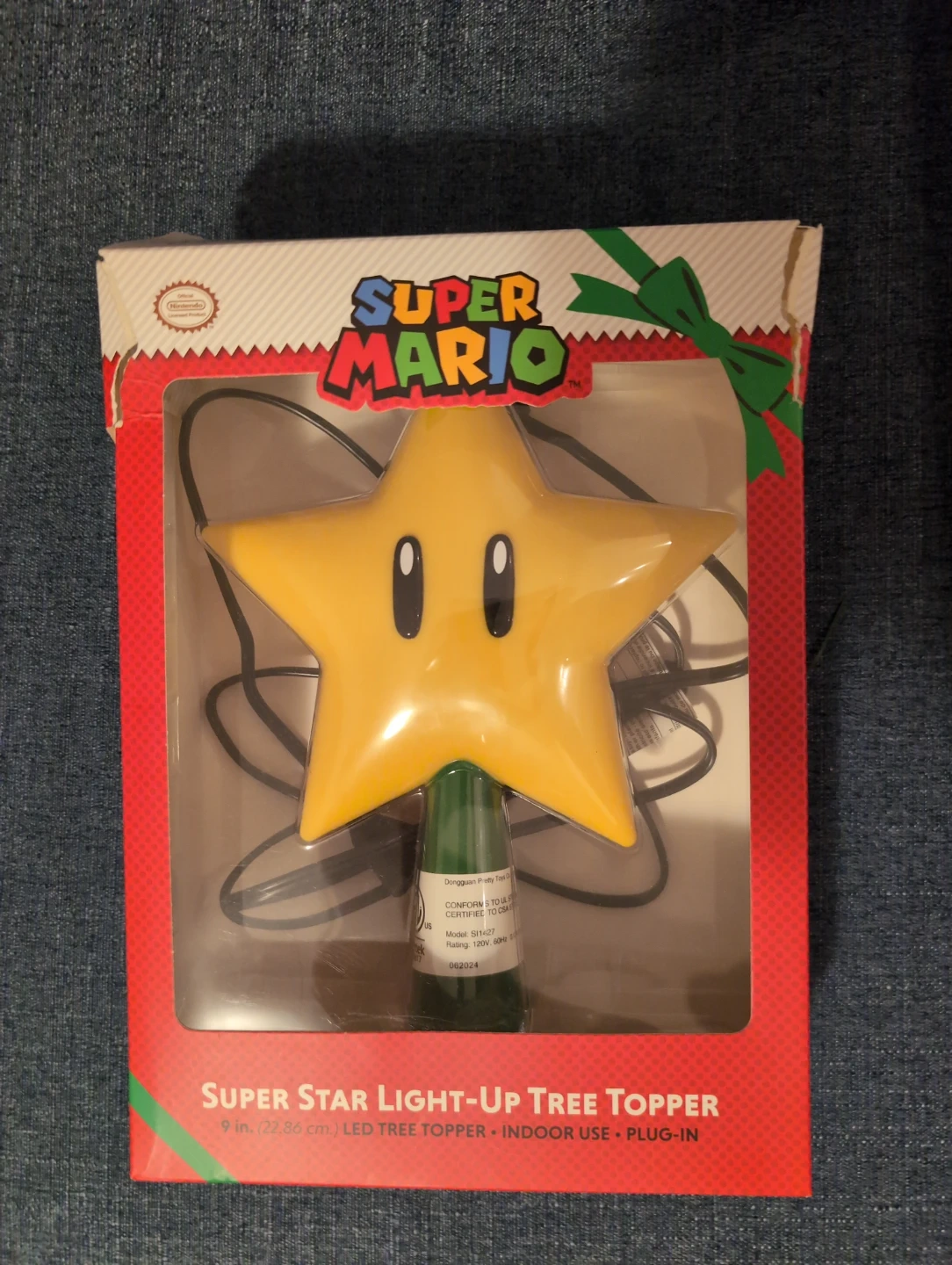 It's a Super Mario Super Star light-up tree topper. It's 9 inches (22.86 cm) and made for indoor use. Just plug it in!