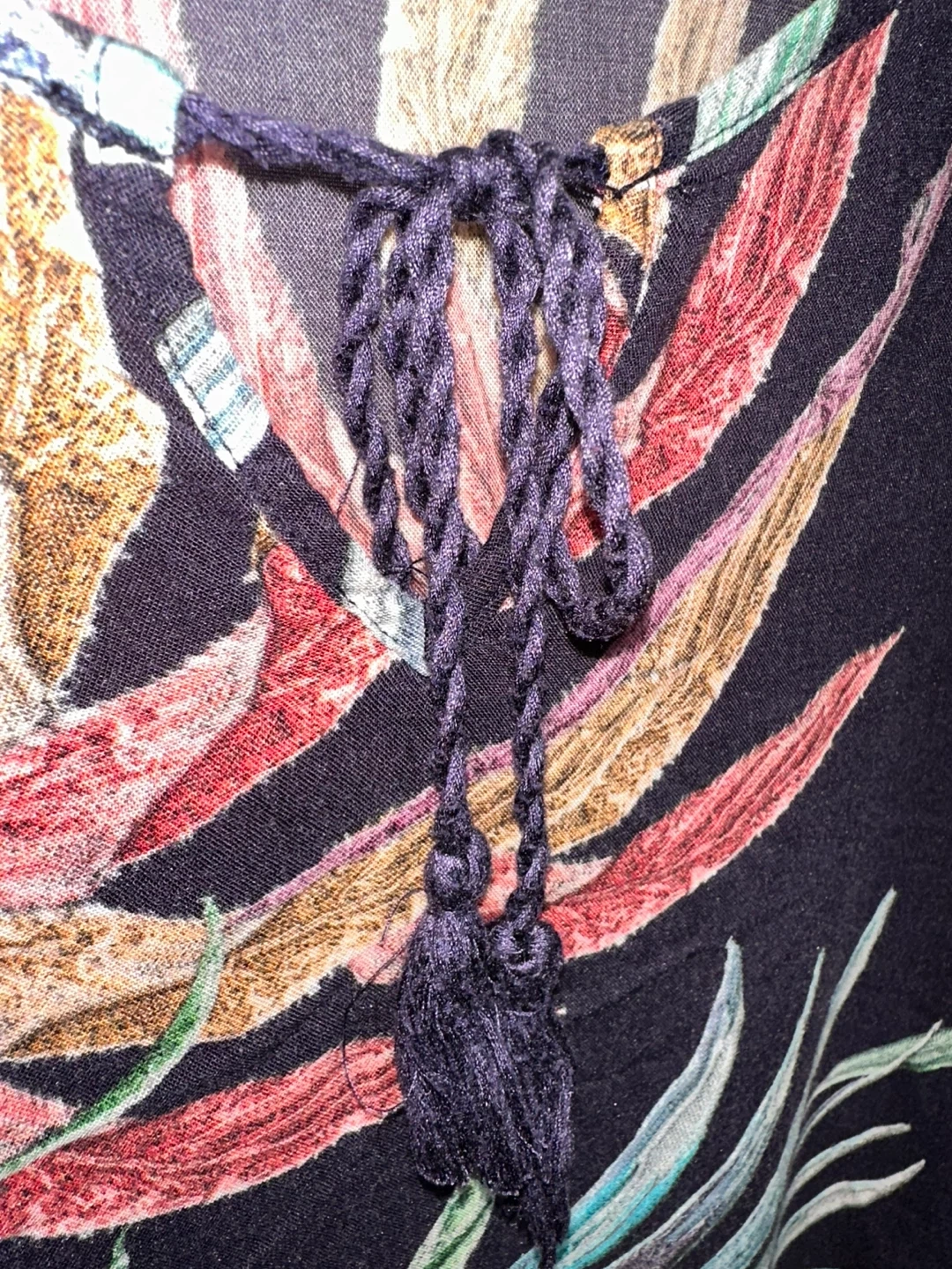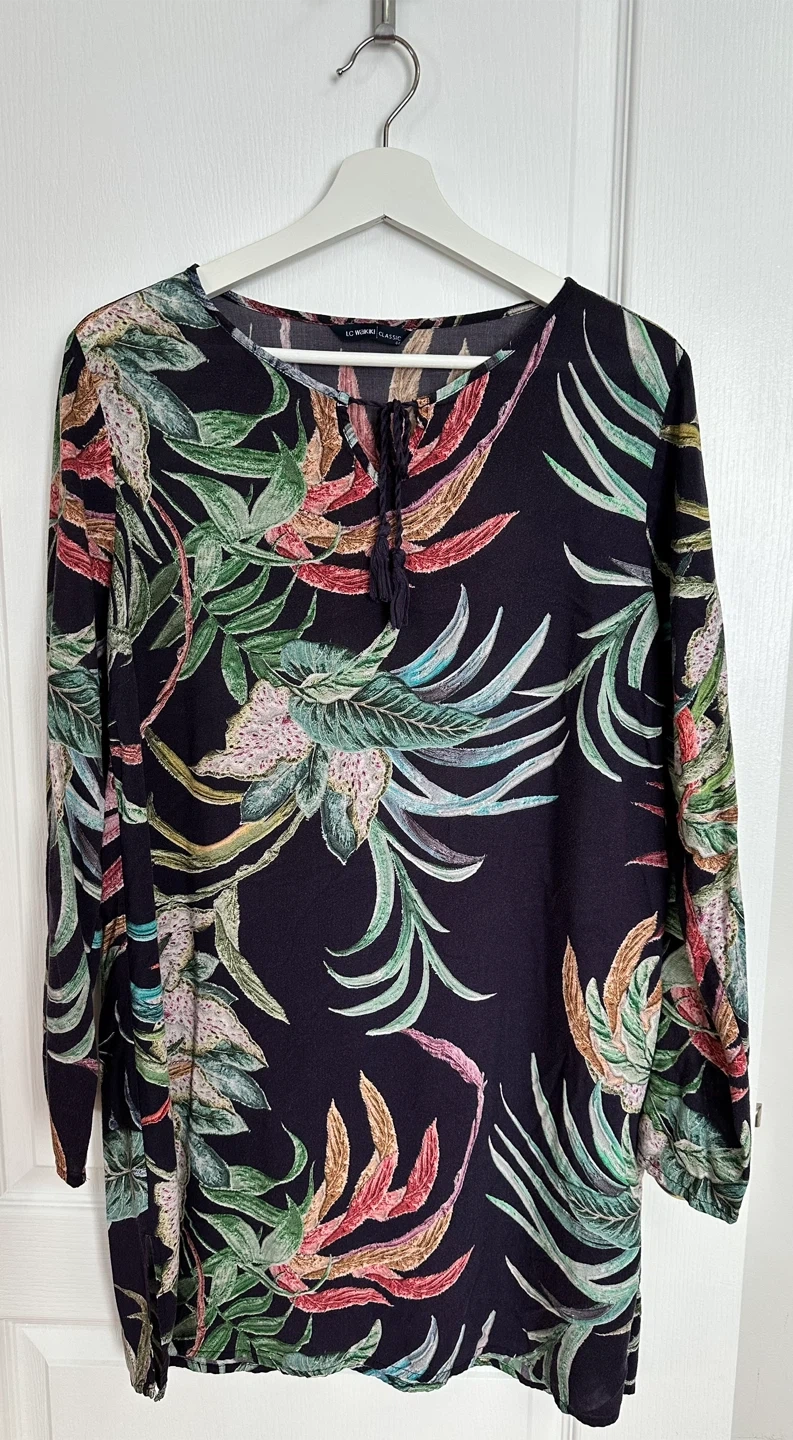 A stylish gently used LC Waikiki Classic tunic dress in size 44. It features a colourful floral print, a tie neckline with a tassel detail, and small slits at the hem. The long sleeves and lightweight fabric make it suitable for both warmer and cooler weather.