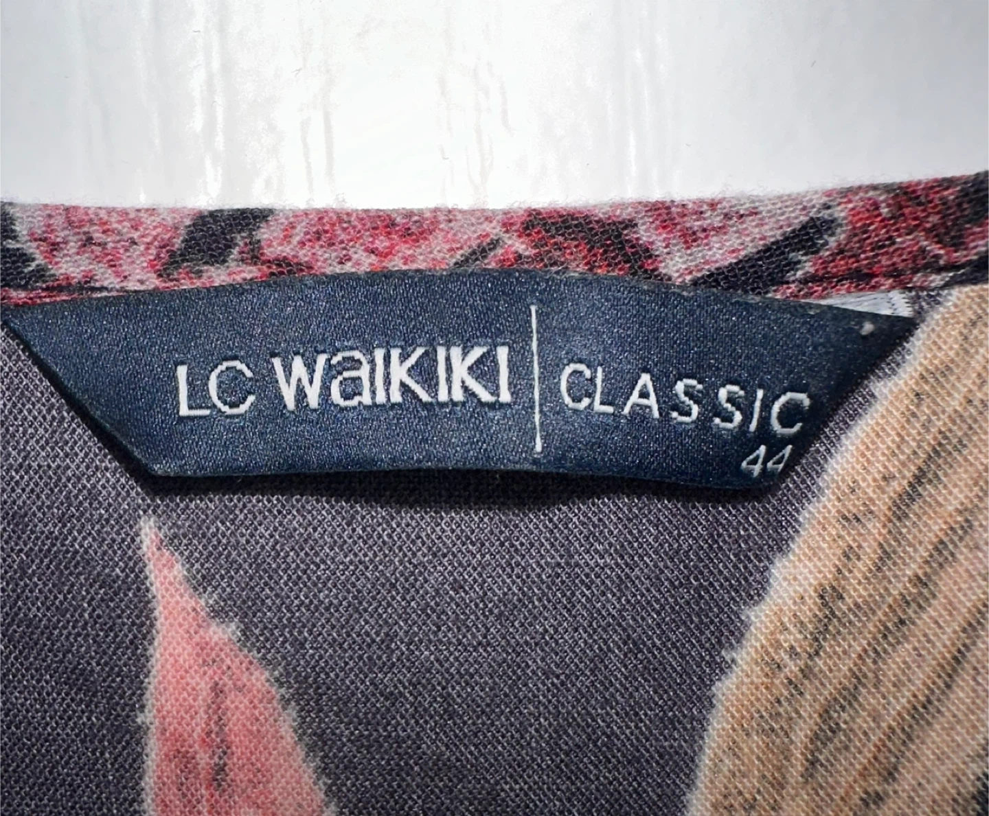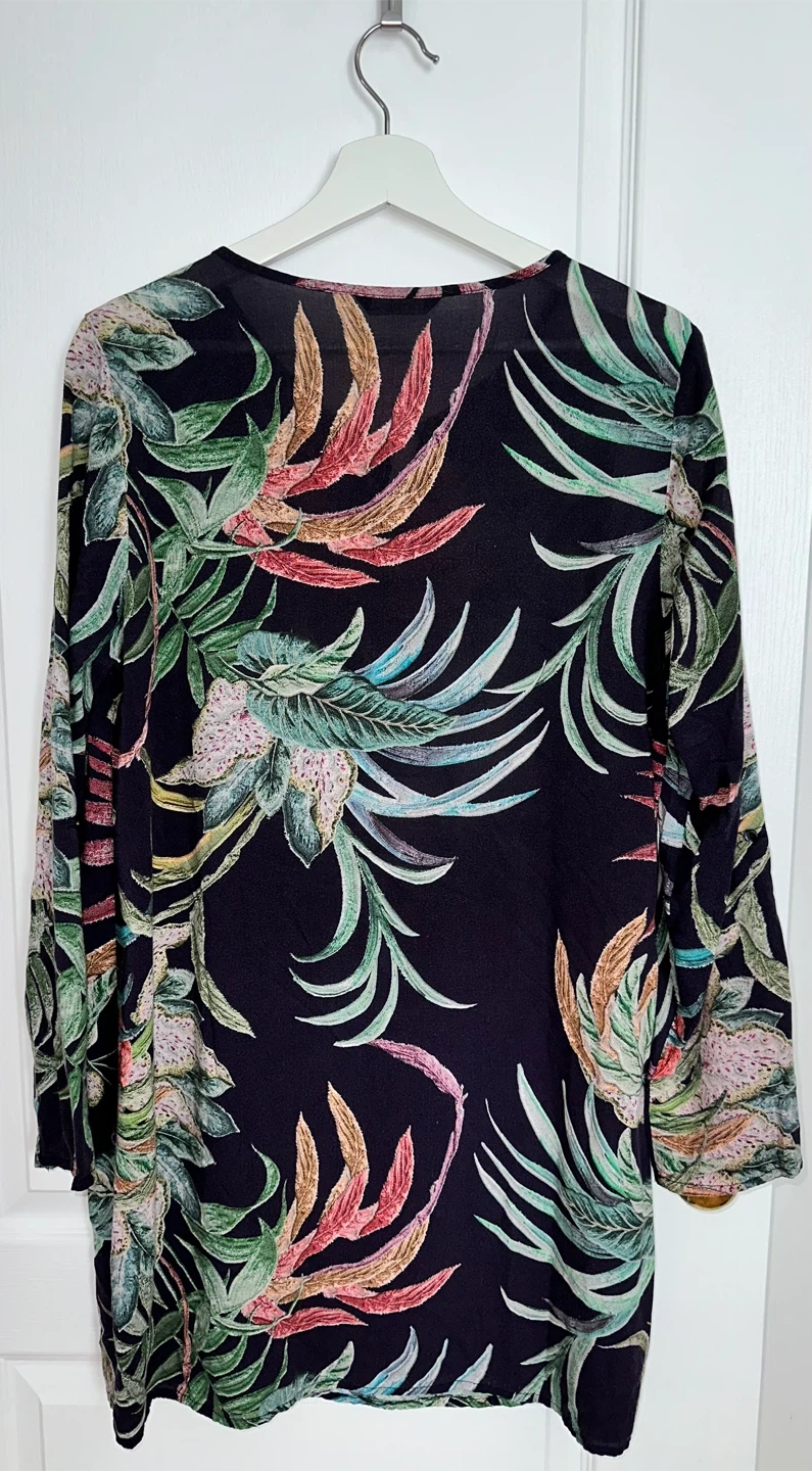 A stylish gently used LC Waikiki Classic tunic dress in size 44. It features a colourful floral print, a tie neckline with a tassel detail, and small slits at the hem. The long sleeves and lightweight fabric make it suitable for both warmer and cooler weather.