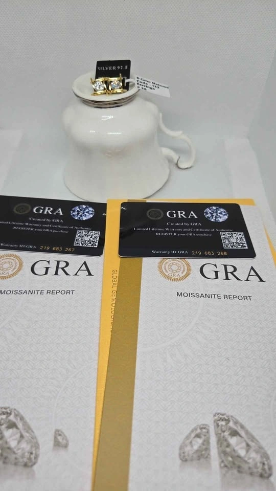 Brilliant 1 carat moissanite earrings (2 carat total). Metal: Gold-plated silver. Color: D, Clarity: VVS1. Comes with GRA certificates and cards. GRA numbers engraved on the stones. Meet up in Richmond (afternoons) or New Westminster (Monday to Wednesday by appointment).