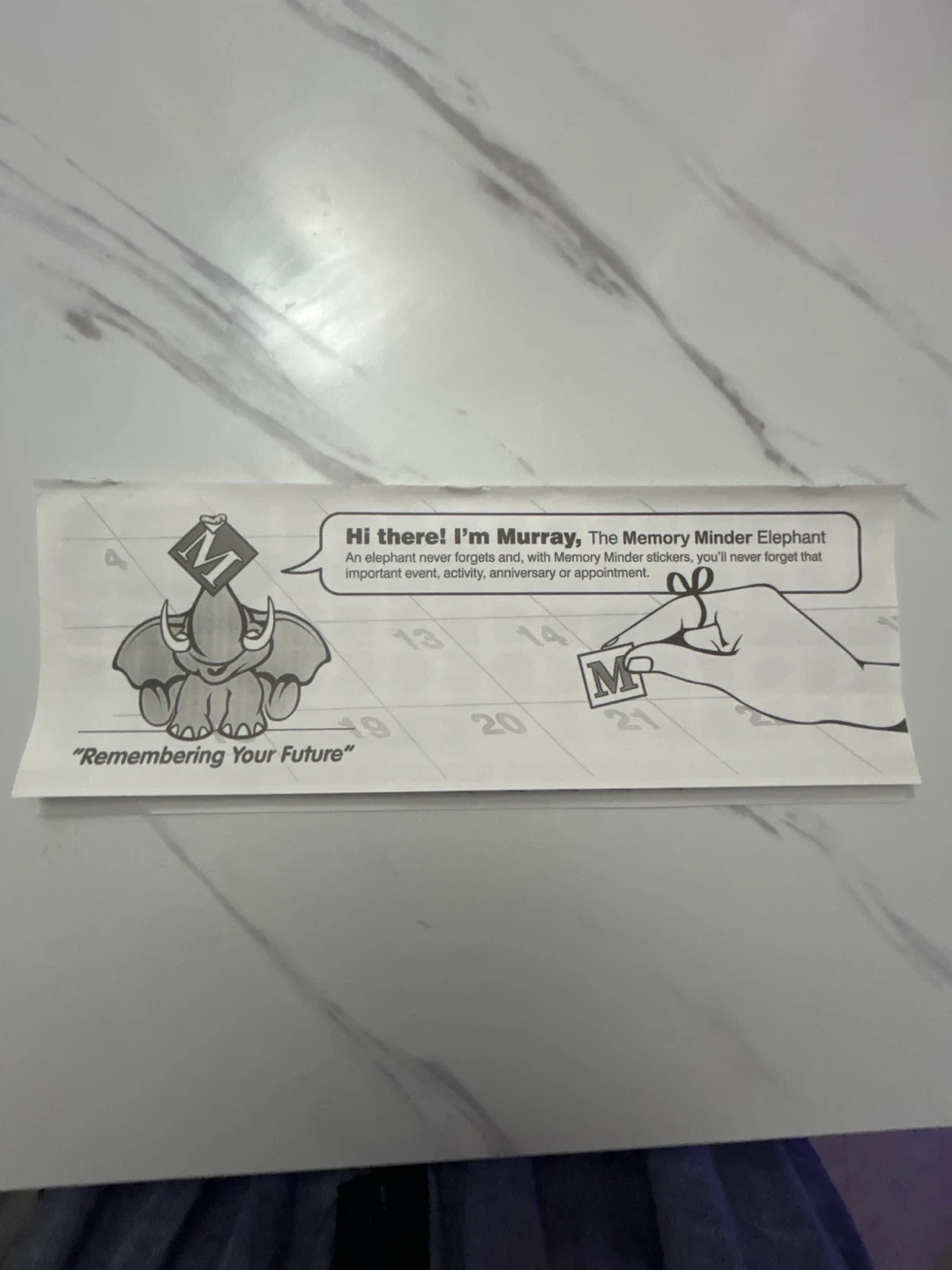 Giving away a sheet of Memory Minder Elephant stickers. These stickers are designed to help you remember important events, activities, anniversaries, or appointments. They feature Murray, the Memory Minder Elephant!