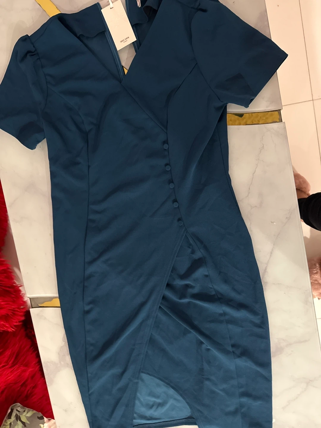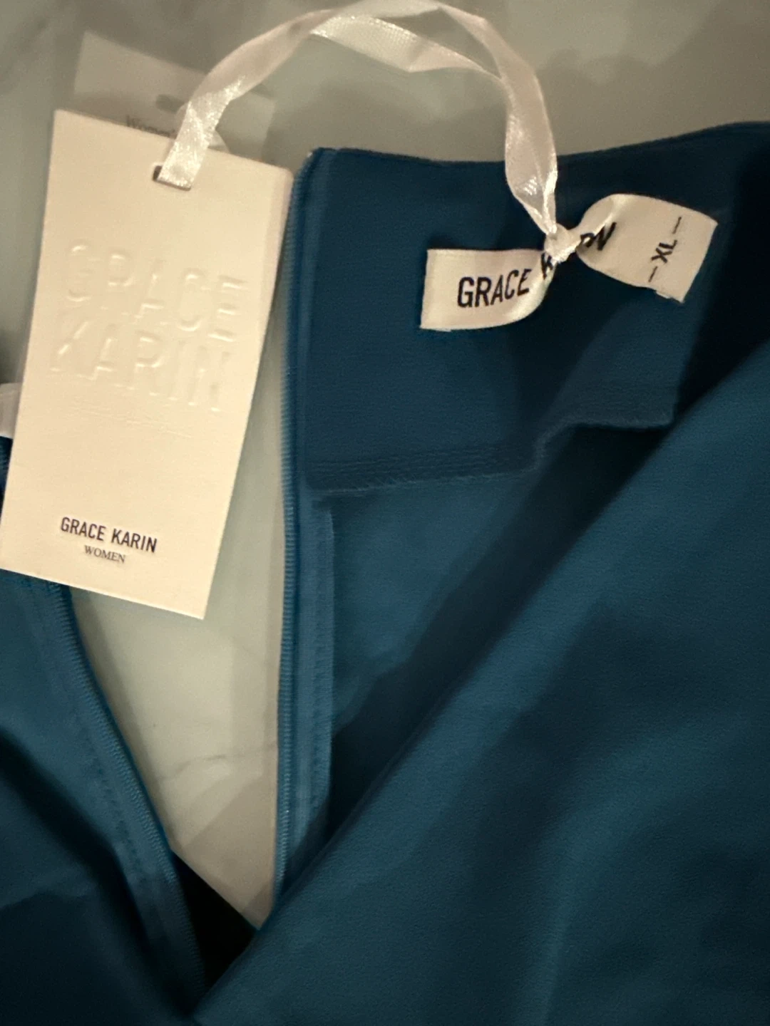 This Grace Karin women's dress features a teal blue color and short sleeves. It has a V-neckline with a button-front detail and a wrap-style skirt. The size is XL. It's a stylish option for various occasions!