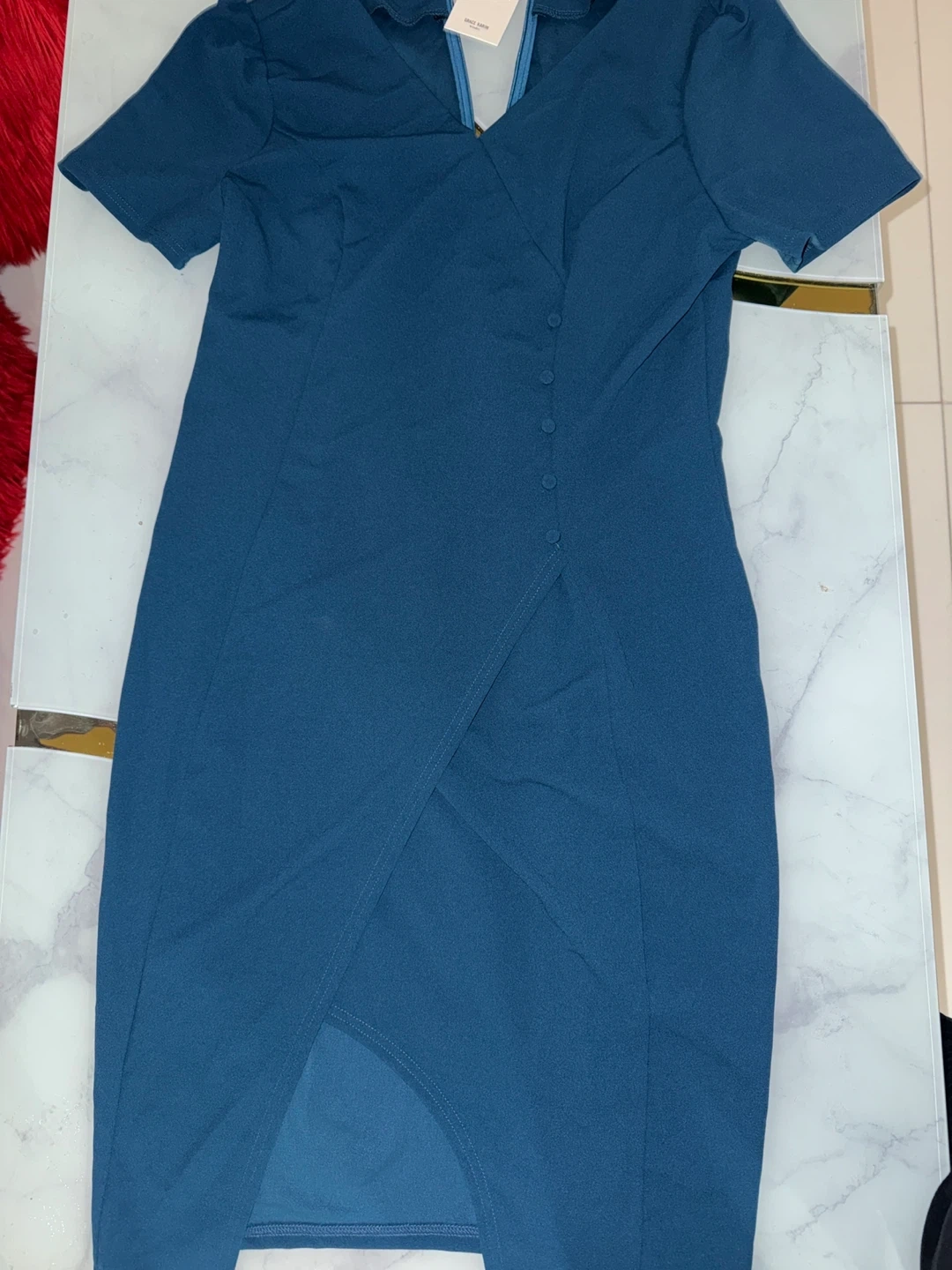 This Grace Karin women's dress features a teal blue color and short sleeves. It has a V-neckline with a button-front detail and a wrap-style skirt. The size is XL. It's a stylish option for various occasions!