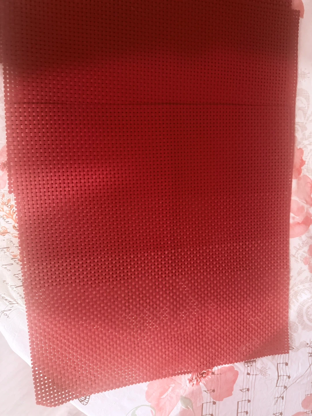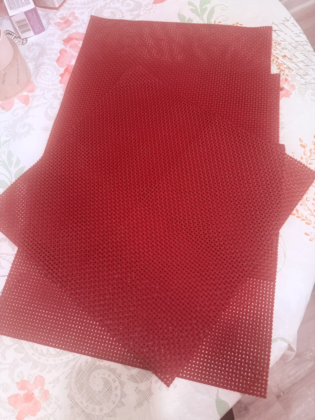 Set of 5 red placemats. Woven plastic material for durability. Easy to wipe clean. Protects your table surface from spills and heat. Perfect for everyday dining or special occasions!