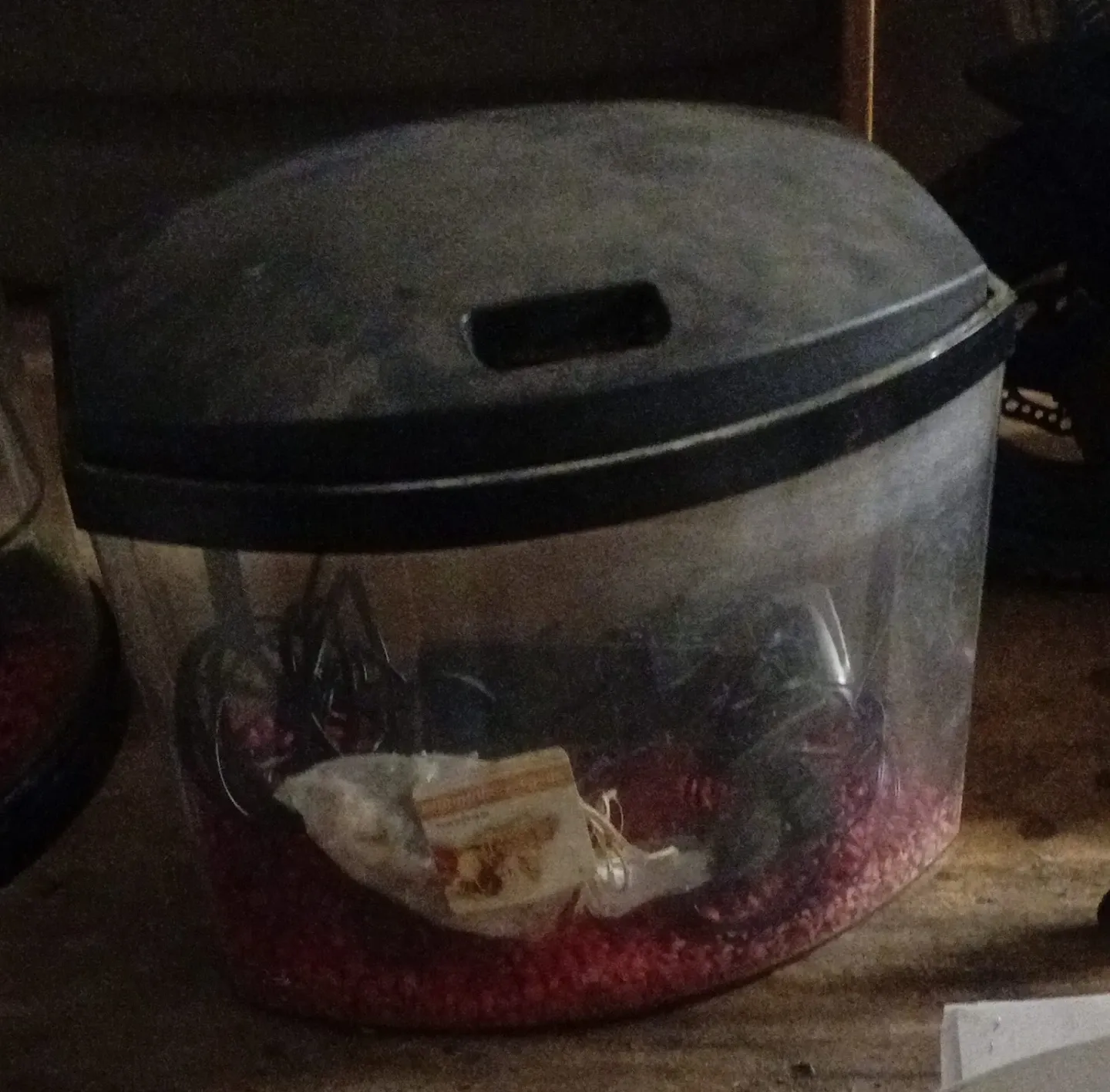 This is a small aquarium, perfect for a betta fish or a few small aquatic pets. It includes pink gravel and some sort of filter or air stone. It's a good size for a desk or small space. It's ready for a new home!