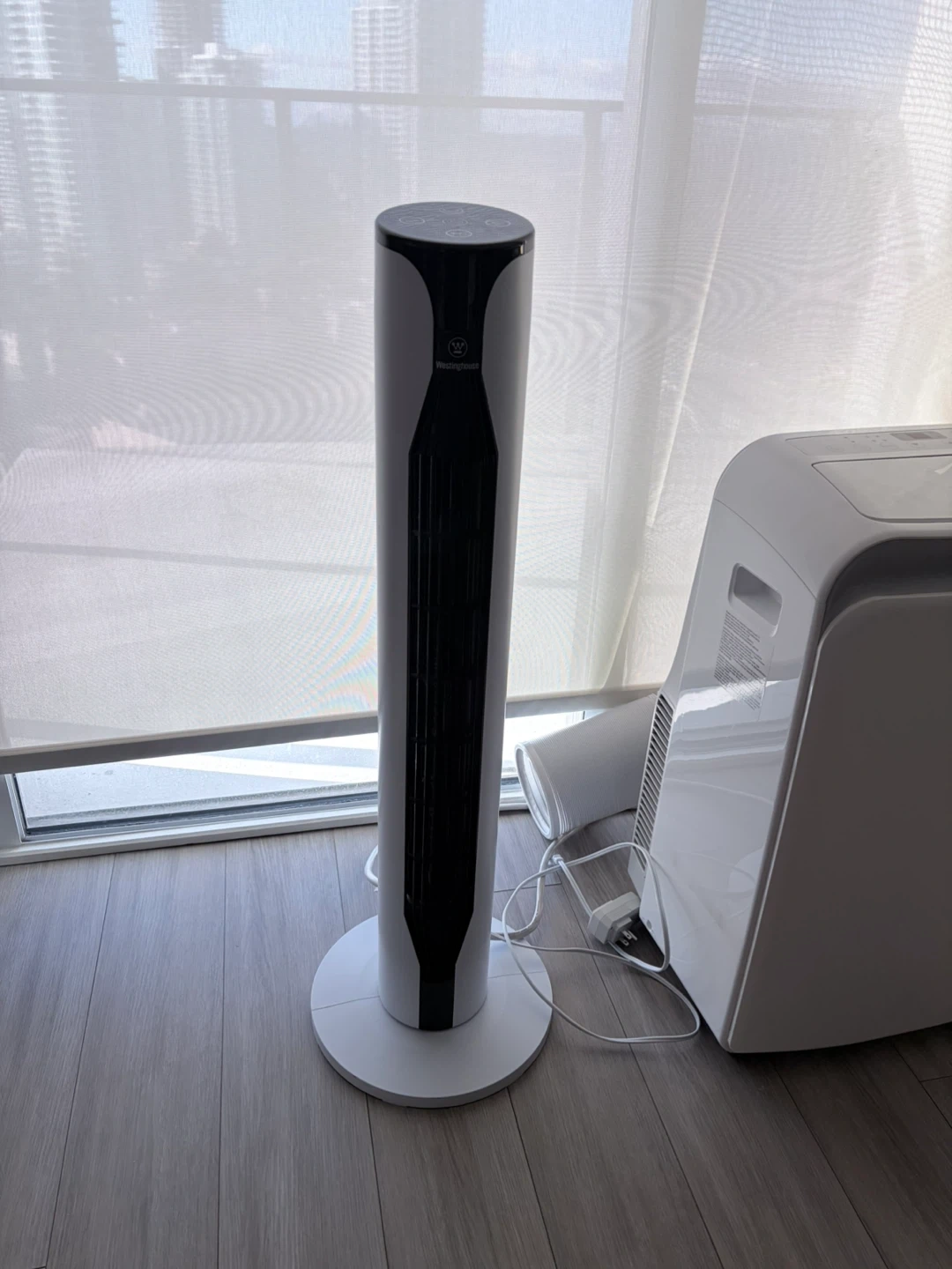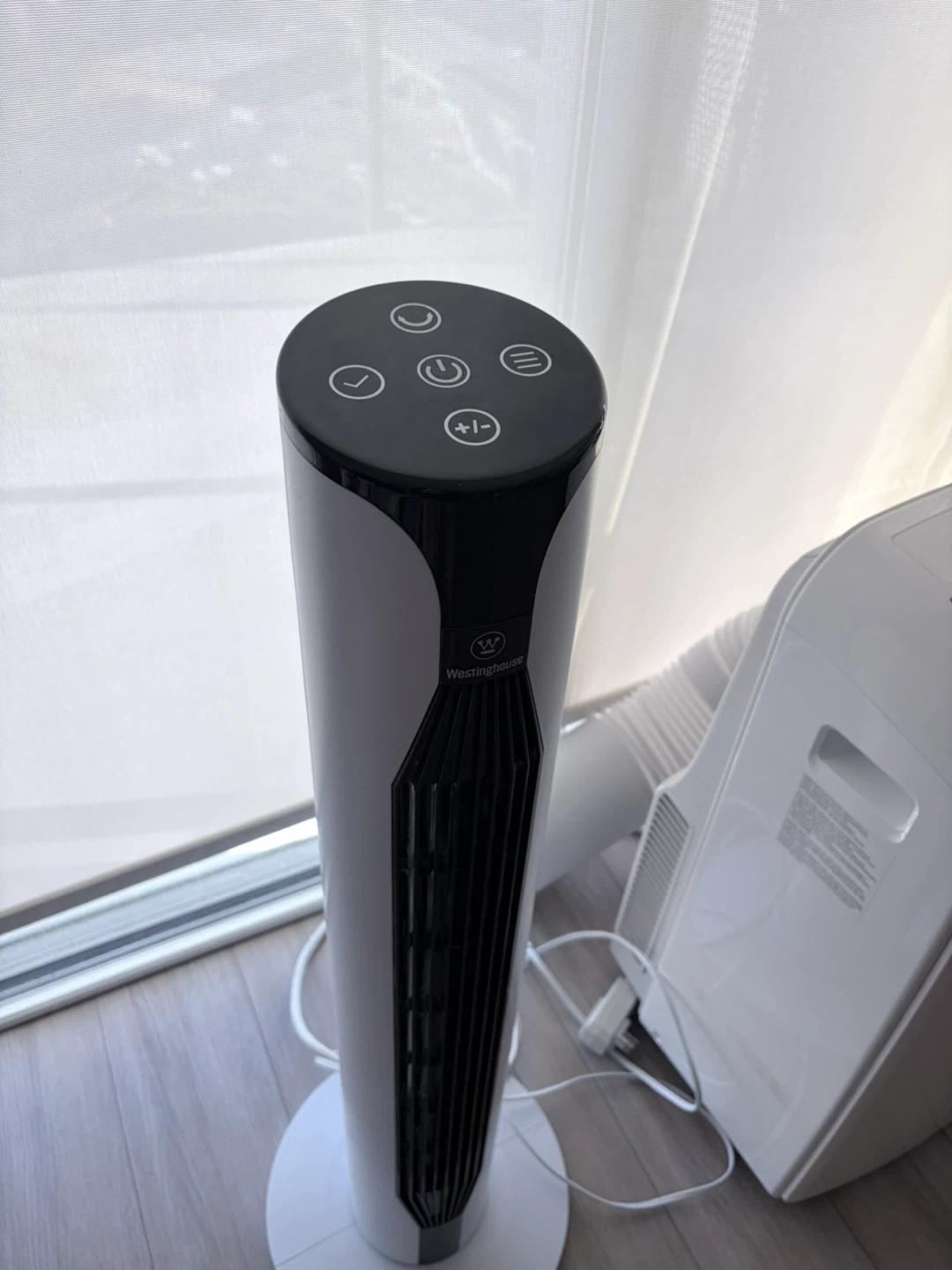 This is a Westinghouse tower fan. It has a sleek white and black design with touch controls on top. It provides a good way to cool a room.