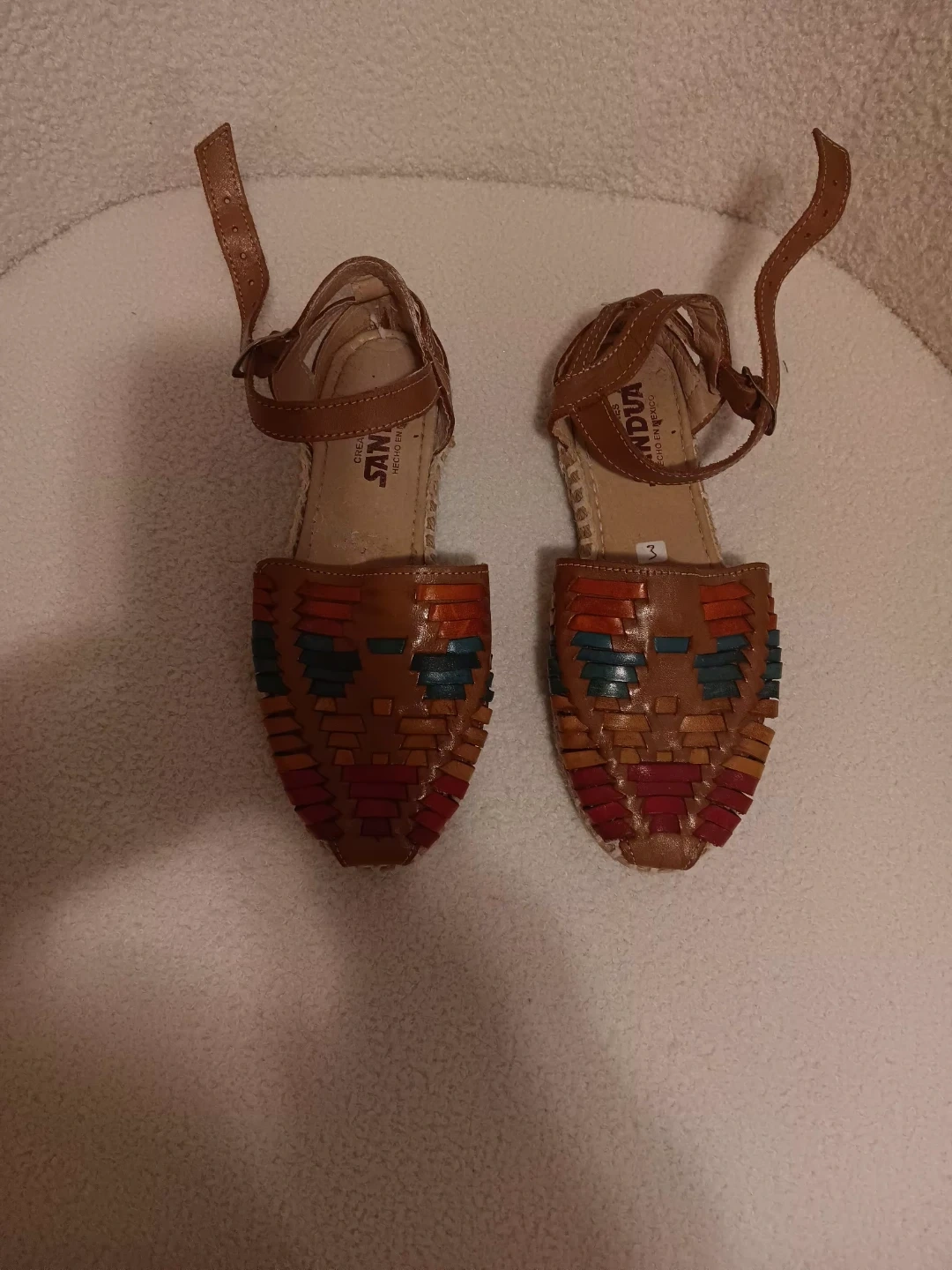 These are a pair of Sandua Huarache sandals in a size 6 They are in good condition and ready for a new owner! They feature a woven leather upper and an ankle strap.