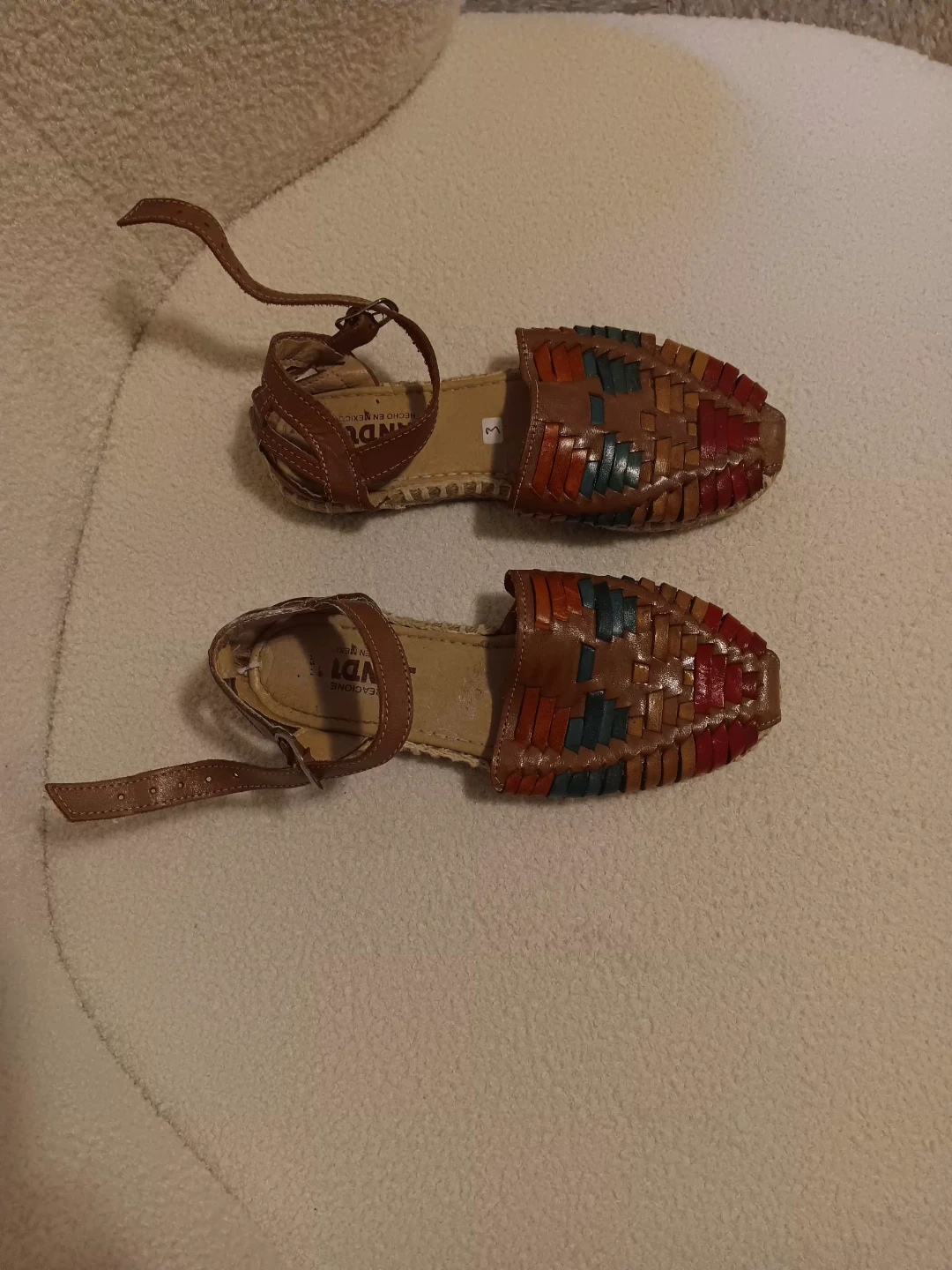 These are a pair of Sandua Huarache sandals in a size 6 They are in good condition and ready for a new owner! They feature a woven leather upper and an ankle strap.