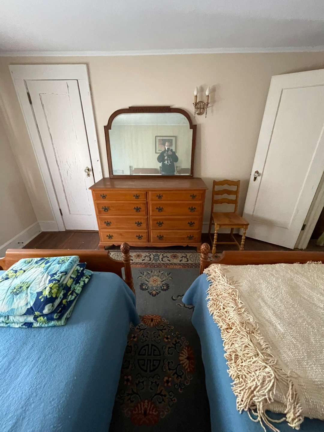 Two wooden twin beds in a classic design. Each bed comes with blue bedding and a complementary throw blanket. These beds are ready to provide a comfortable sleeping space. Found at uncles house, selling to cover funeral expenses
