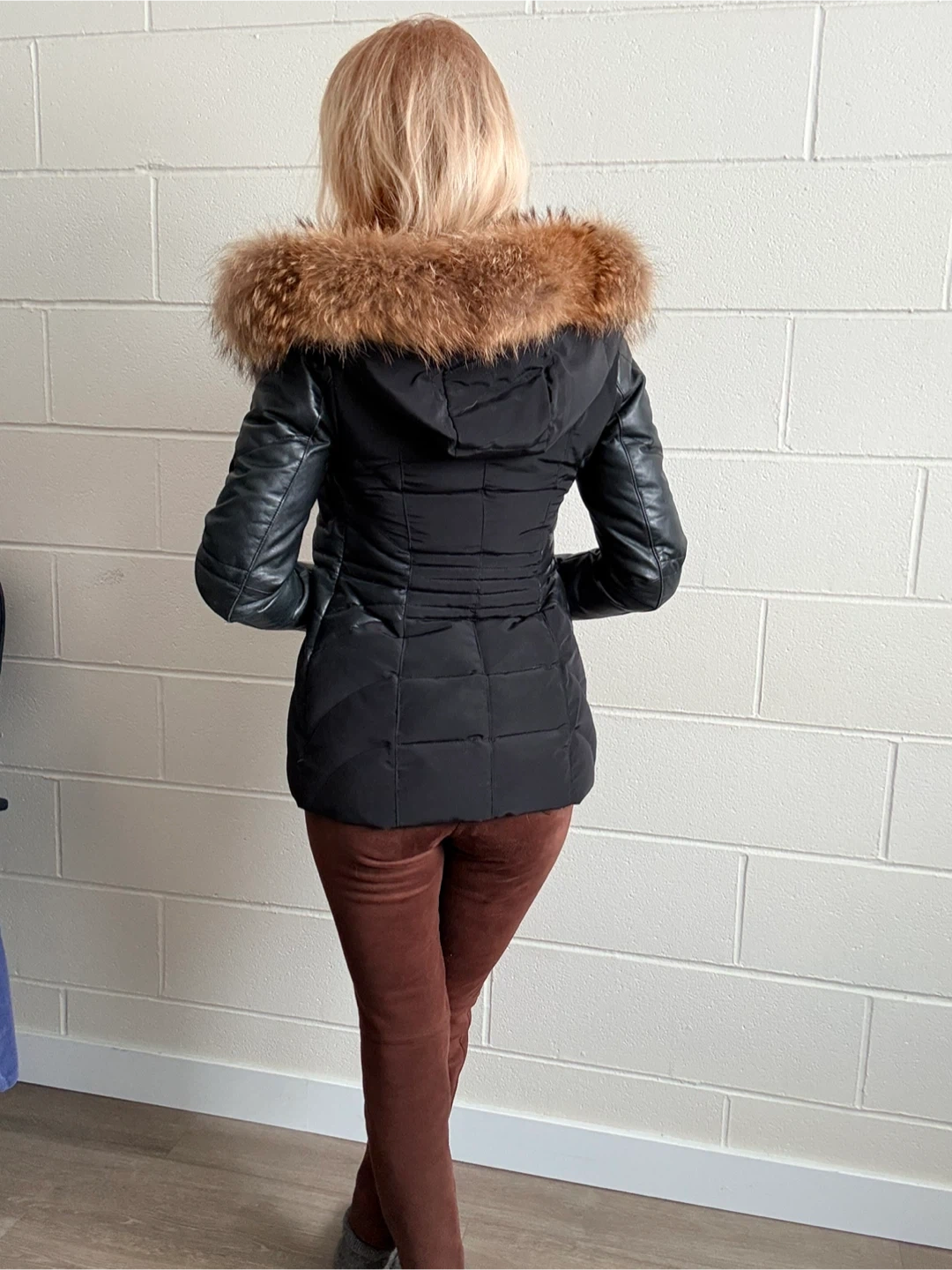 Stunning black winter coat. Features a luxurious fur-trimmed hood, leather sleeves, and a flattering A-line silhouette. Down-filled for warmth and comfort. Size 3XS. Excellent condition, only minor wear to cuffs.