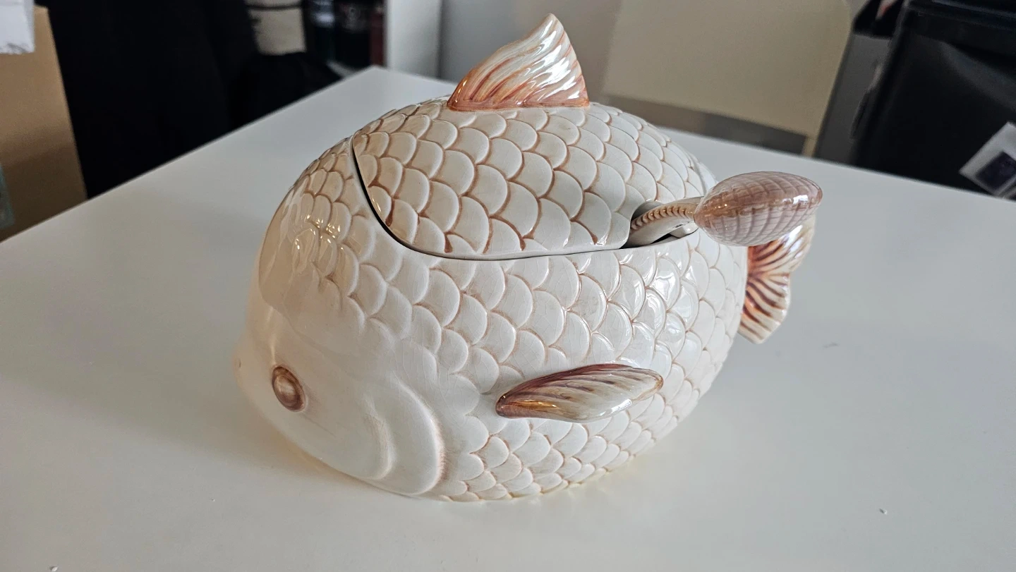 Selling a charming fish-shaped serving dish from By The Sea Naturals! It comes with a lid and a spoon, perfect for serving dips or sauces. The dish is in great condition and would make a lovely addition to any table setting. It also comes with the original box!
