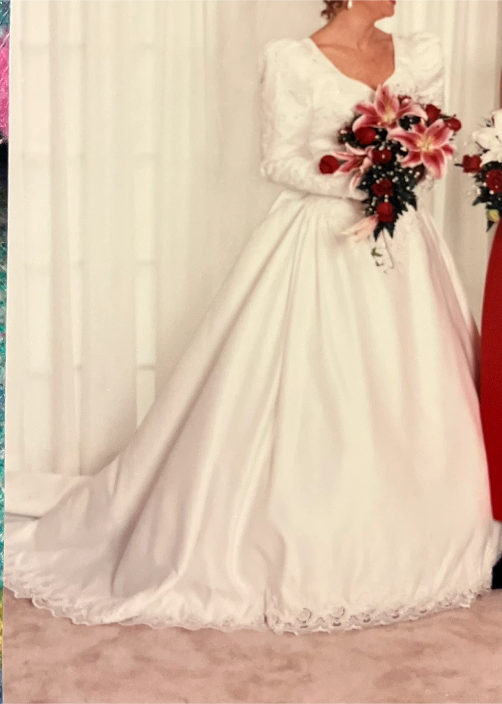 Selling a white wedding dress. It features long sleeves, a sweetheart neckline, and delicate lace detailing. The bow unbuttons to release train. Perfect for someone looking for a classic and elegant style!