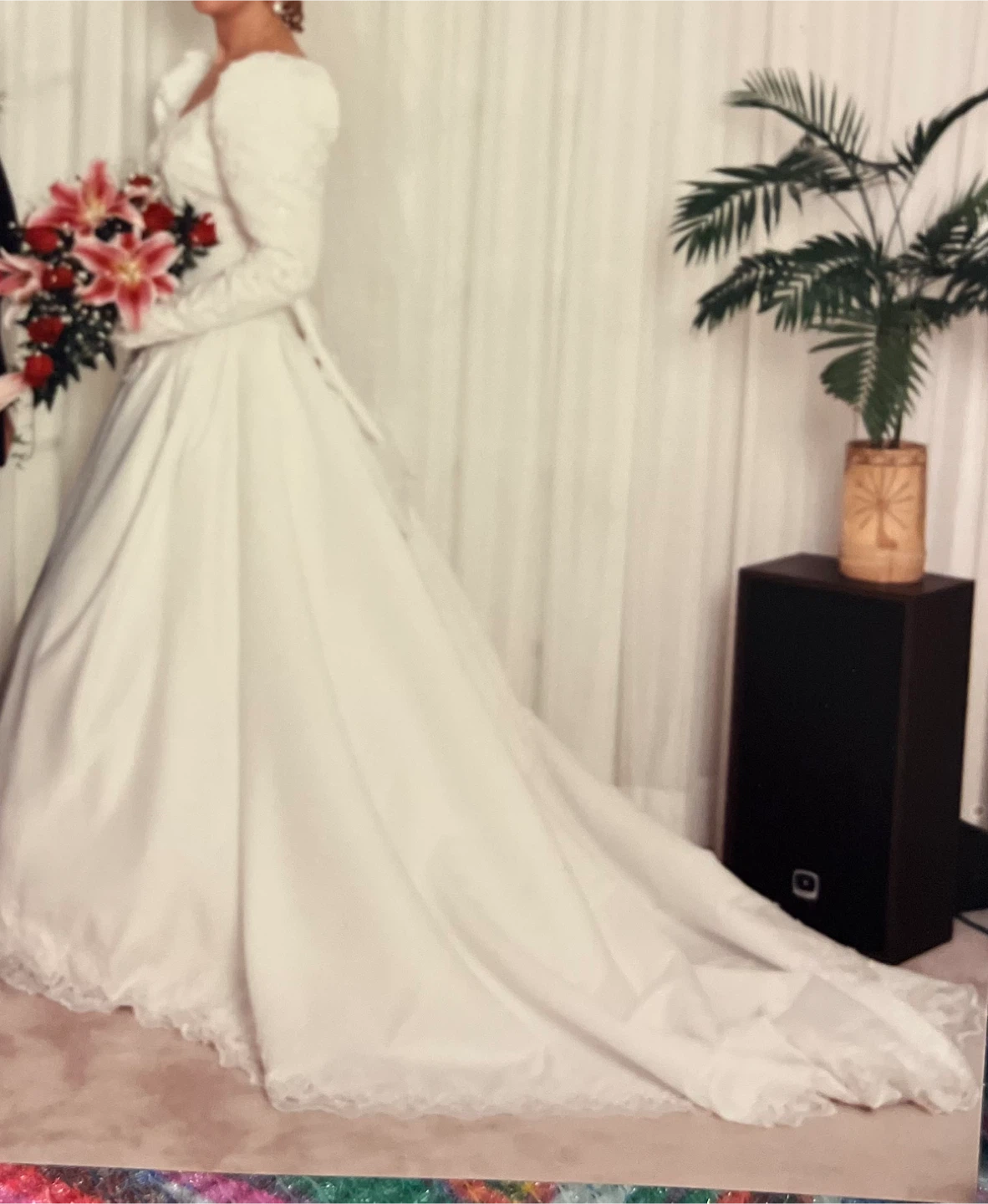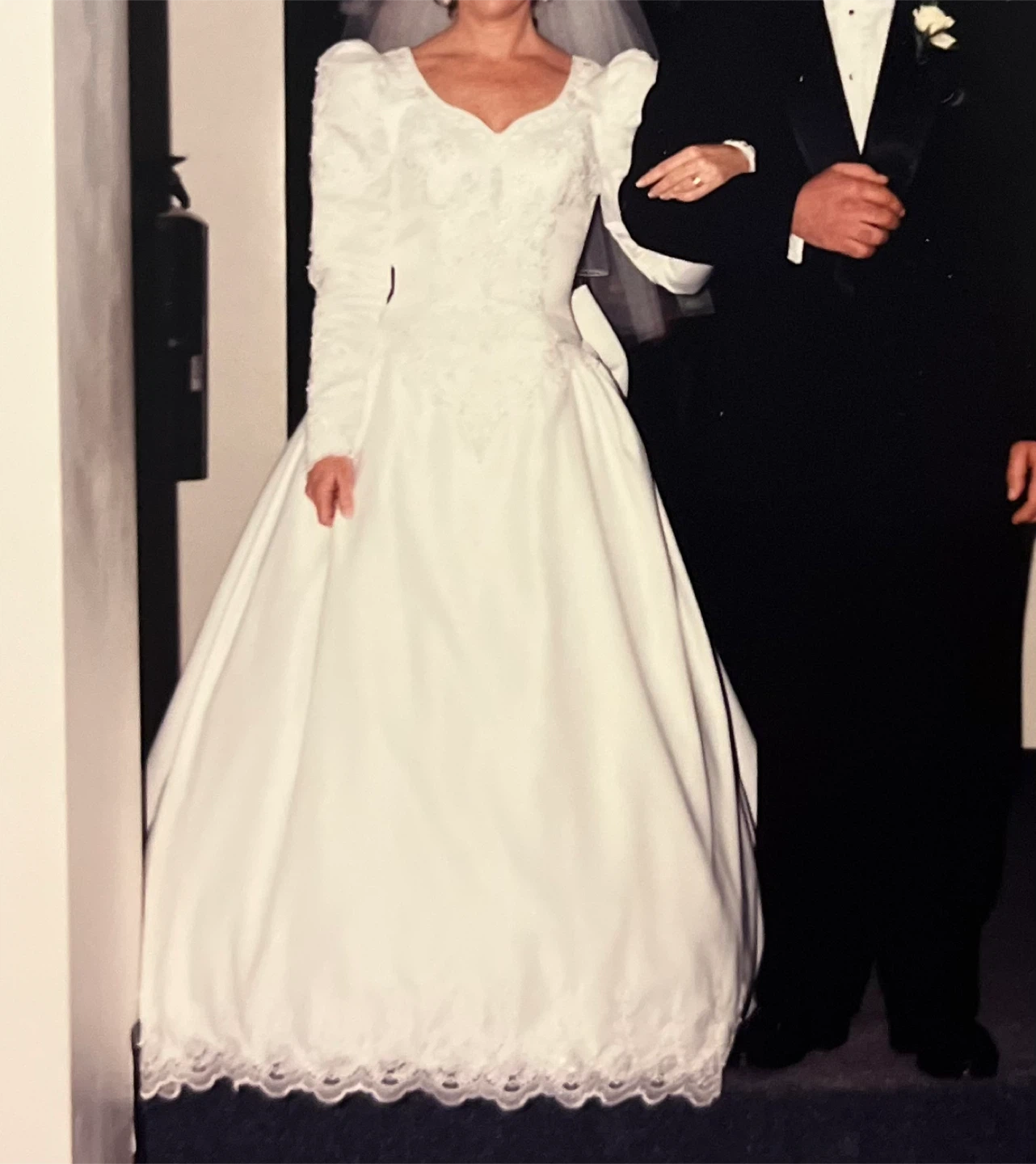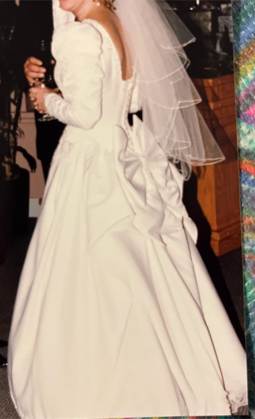 Selling a white wedding dress. It features long sleeves, a sweetheart neckline, and delicate lace detailing. The bow unbuttons to release train. Perfect for someone looking for a classic and elegant style!