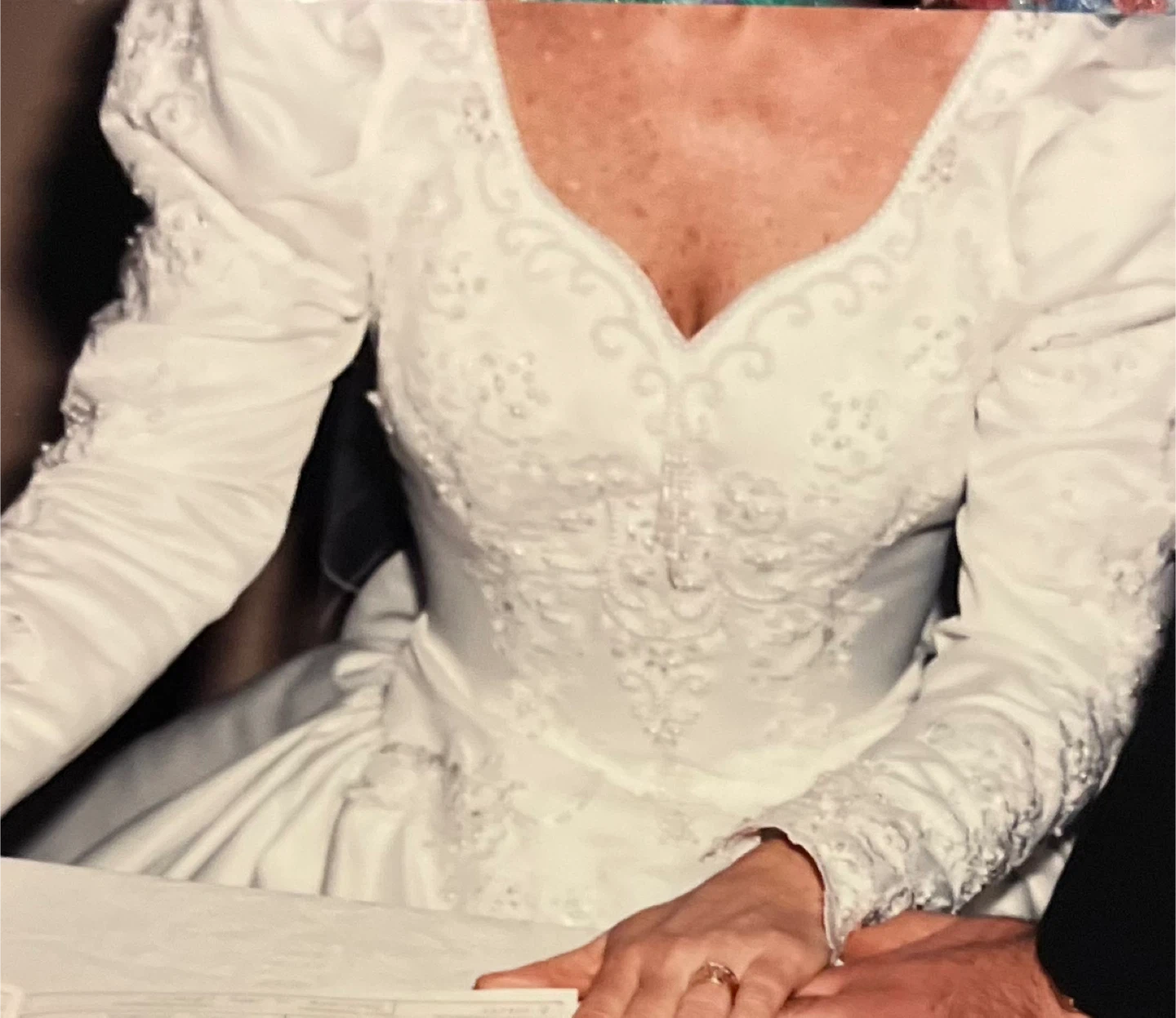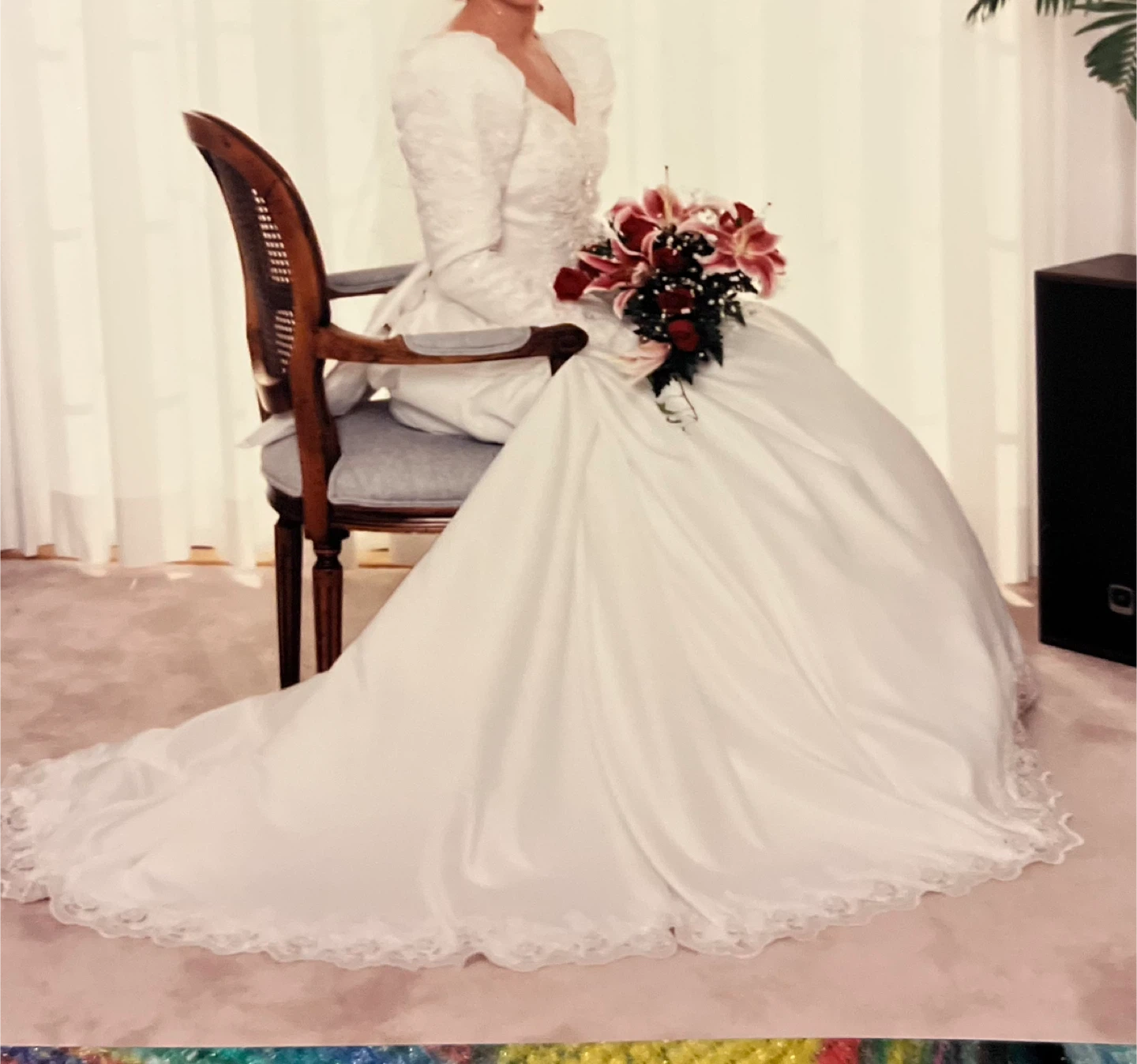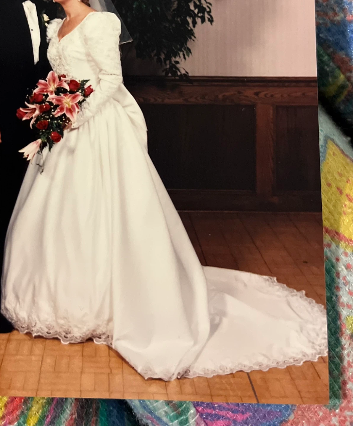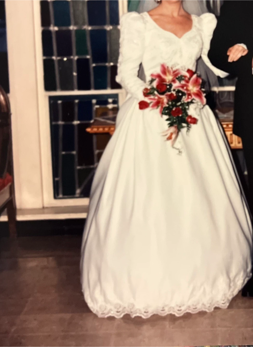 Selling a white wedding dress. It features long sleeves, a sweetheart neckline, and delicate lace detailing. The bow unbuttons to release train. Perfect for someone looking for a classic and elegant style!