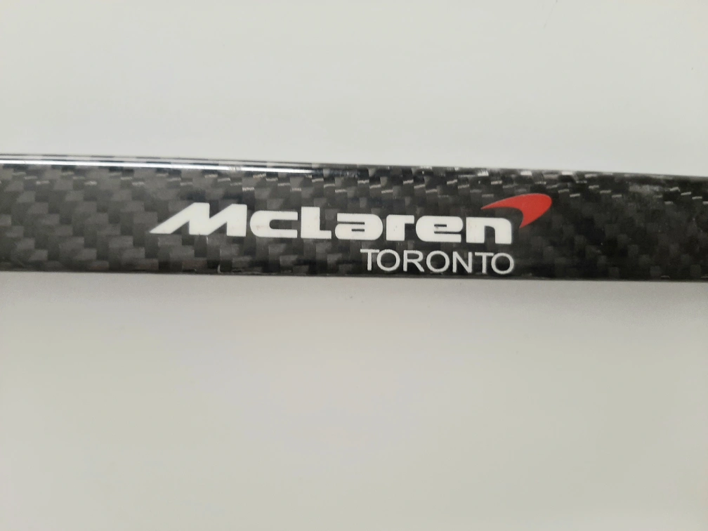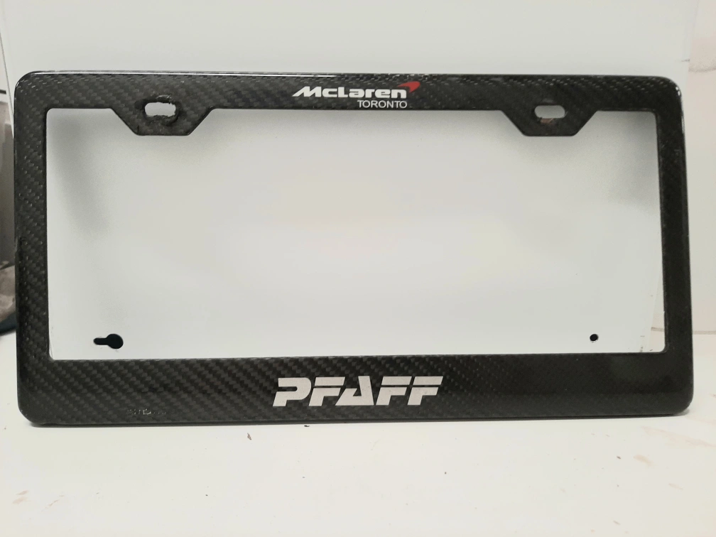 Carbon fibre license plate frame. McLaren Toronto and Pfaff branding. Used in good condition.