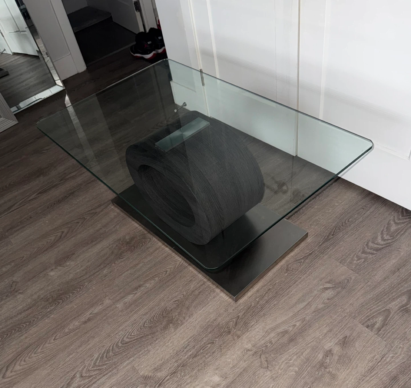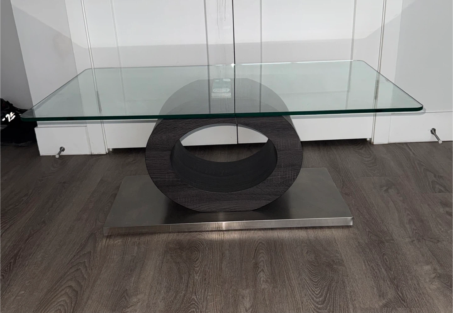 Modern Glass Coffee Table with Unique Grey Wood Base