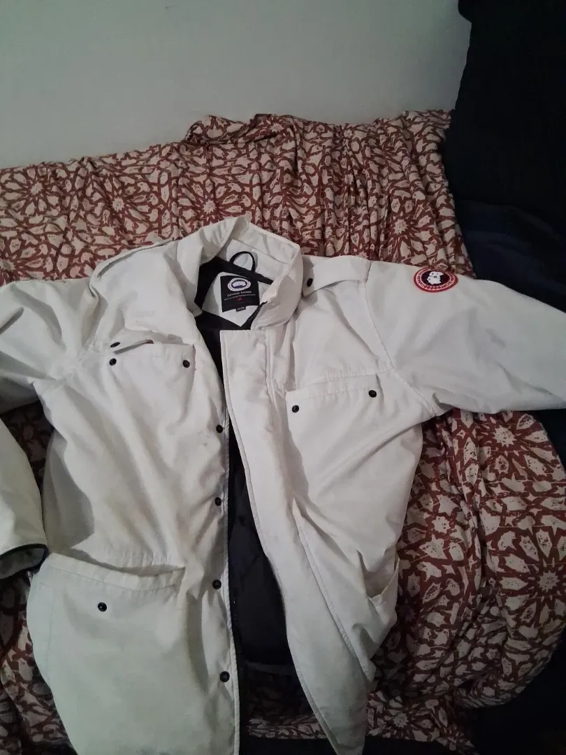 Canada Goose winter jacket in white. It's a durable and warm outerwear piece. This jacket is suitable for cold weather conditions.