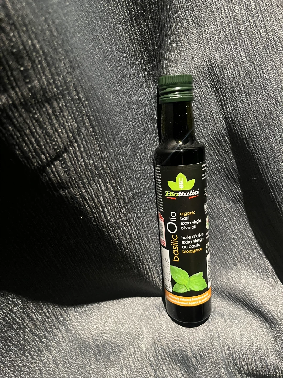 BioItalia organic basil extra virgin olive oil. 250ml bottle. Best before date is 2028 Jan 21.