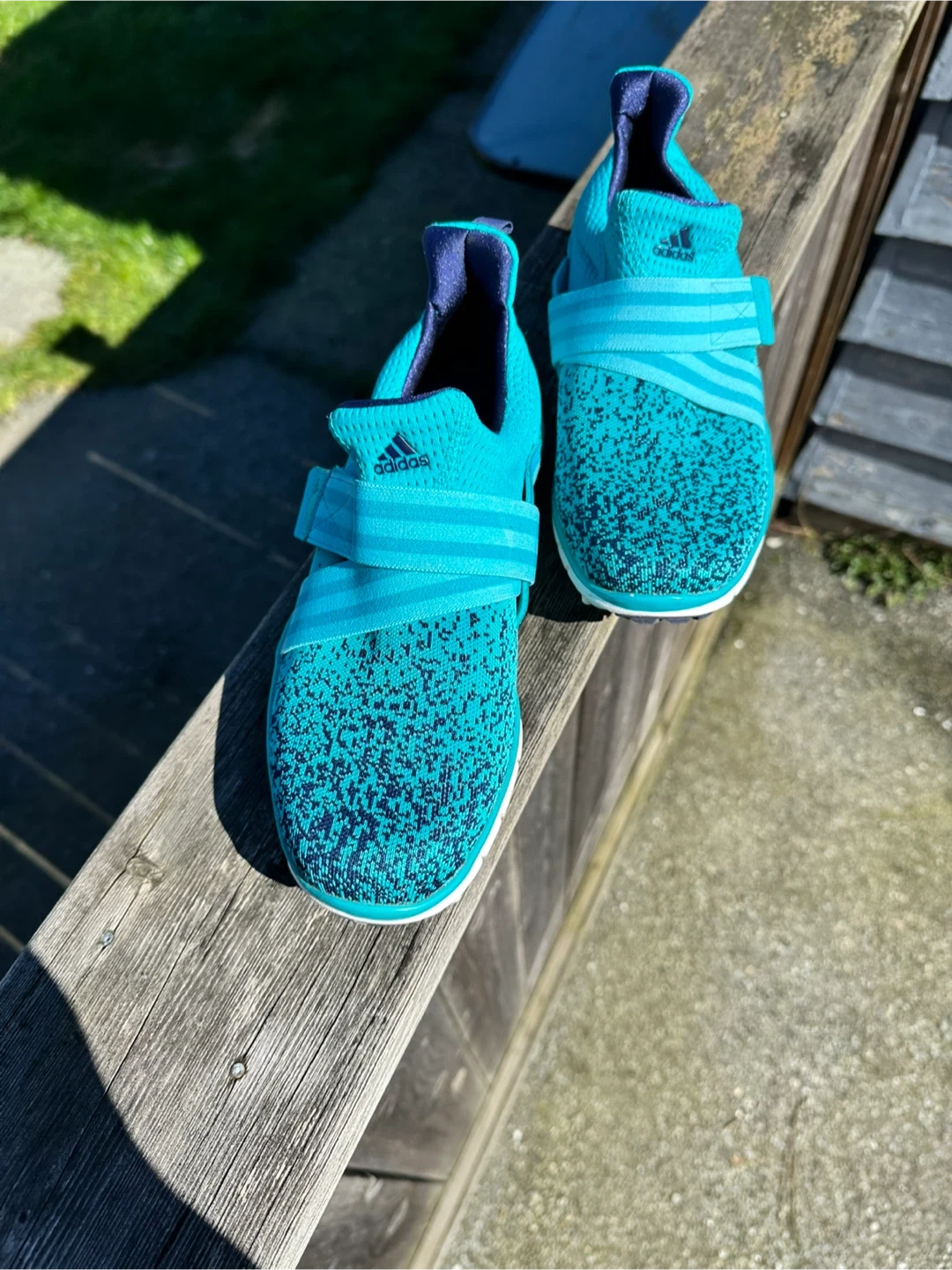 These Adidas shoes come in a vibrant teal blue colour. They feature a knit upper and a secure strap closure system. The durable rubber outsole provides excellent traction.