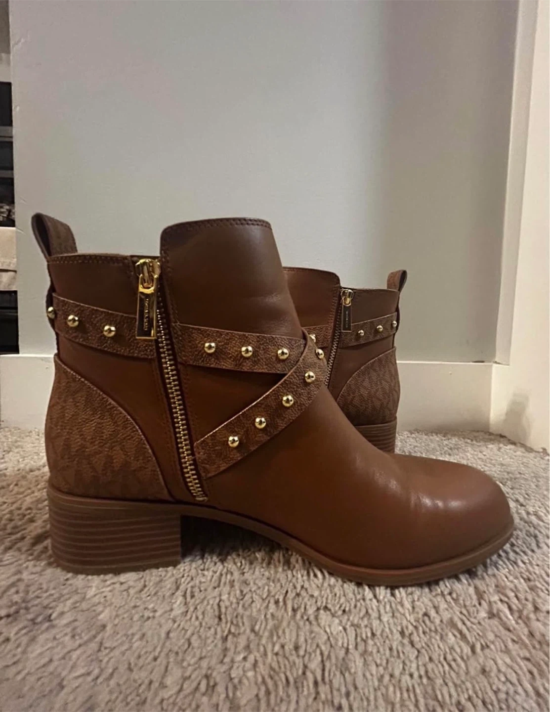 These Michael Kors ankle boots are made of brown leather with gold-tone hardware and studded straps. They feature side zippers for easy on and off. The bottoms are also branded.