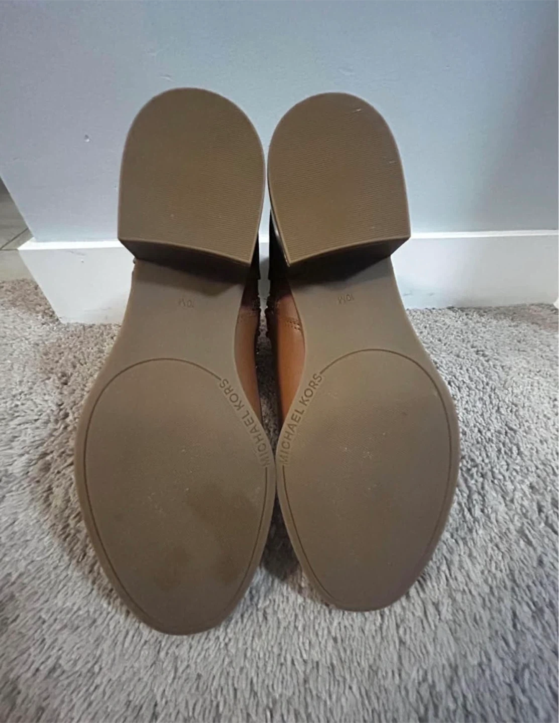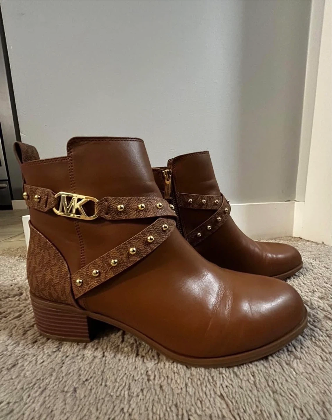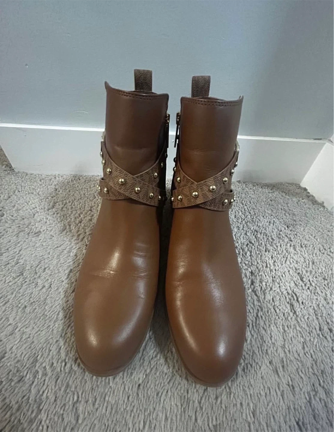 These Michael Kors ankle boots are made of brown leather with gold-tone hardware and studded straps. They feature side zippers for easy on and off. The bottoms are also branded.