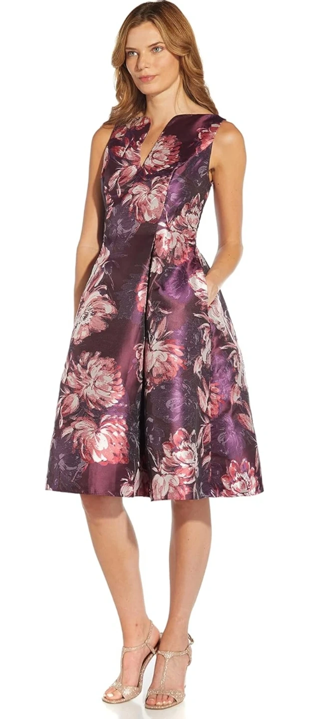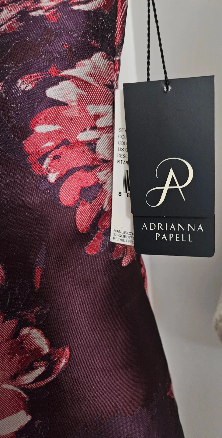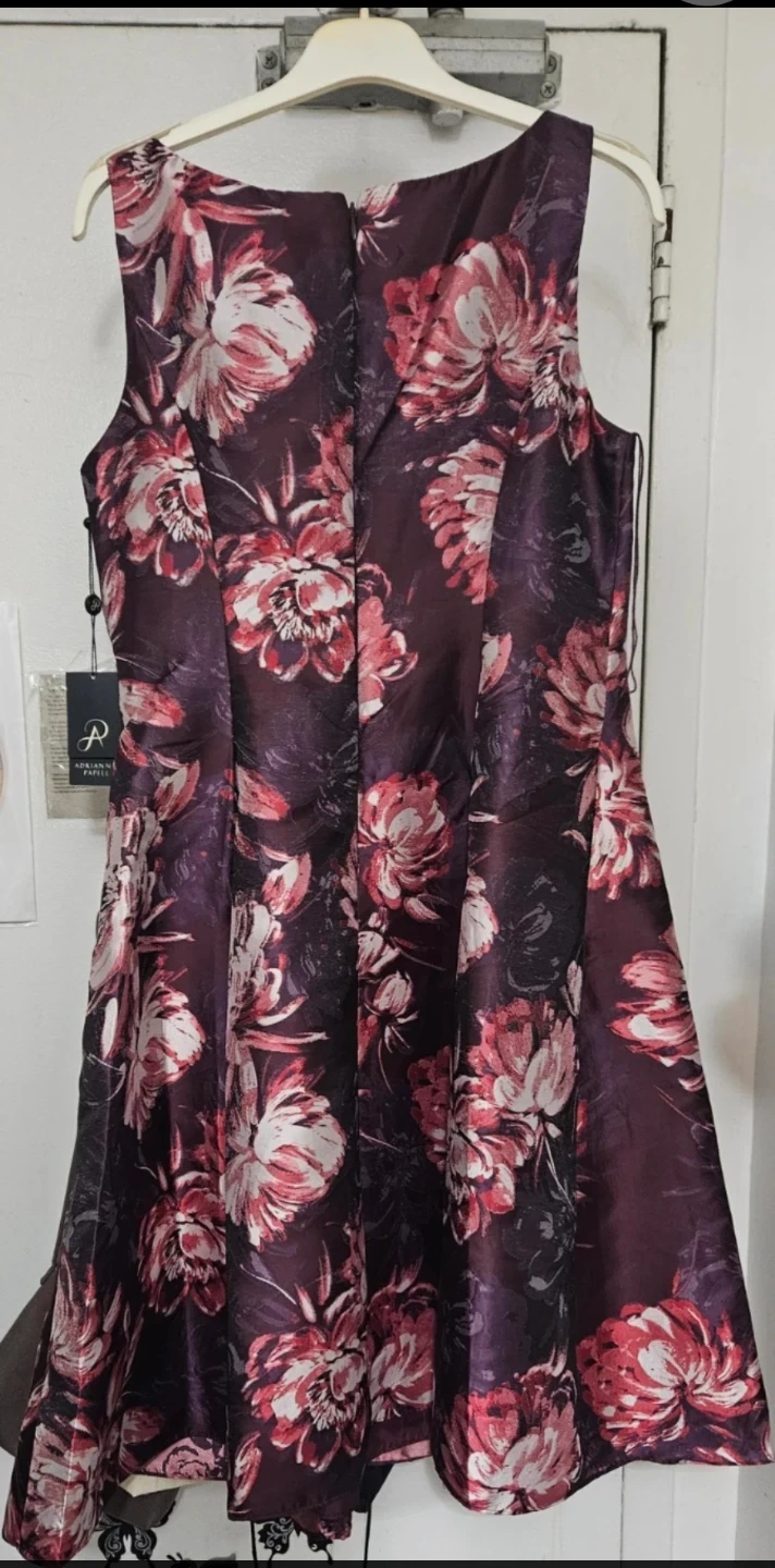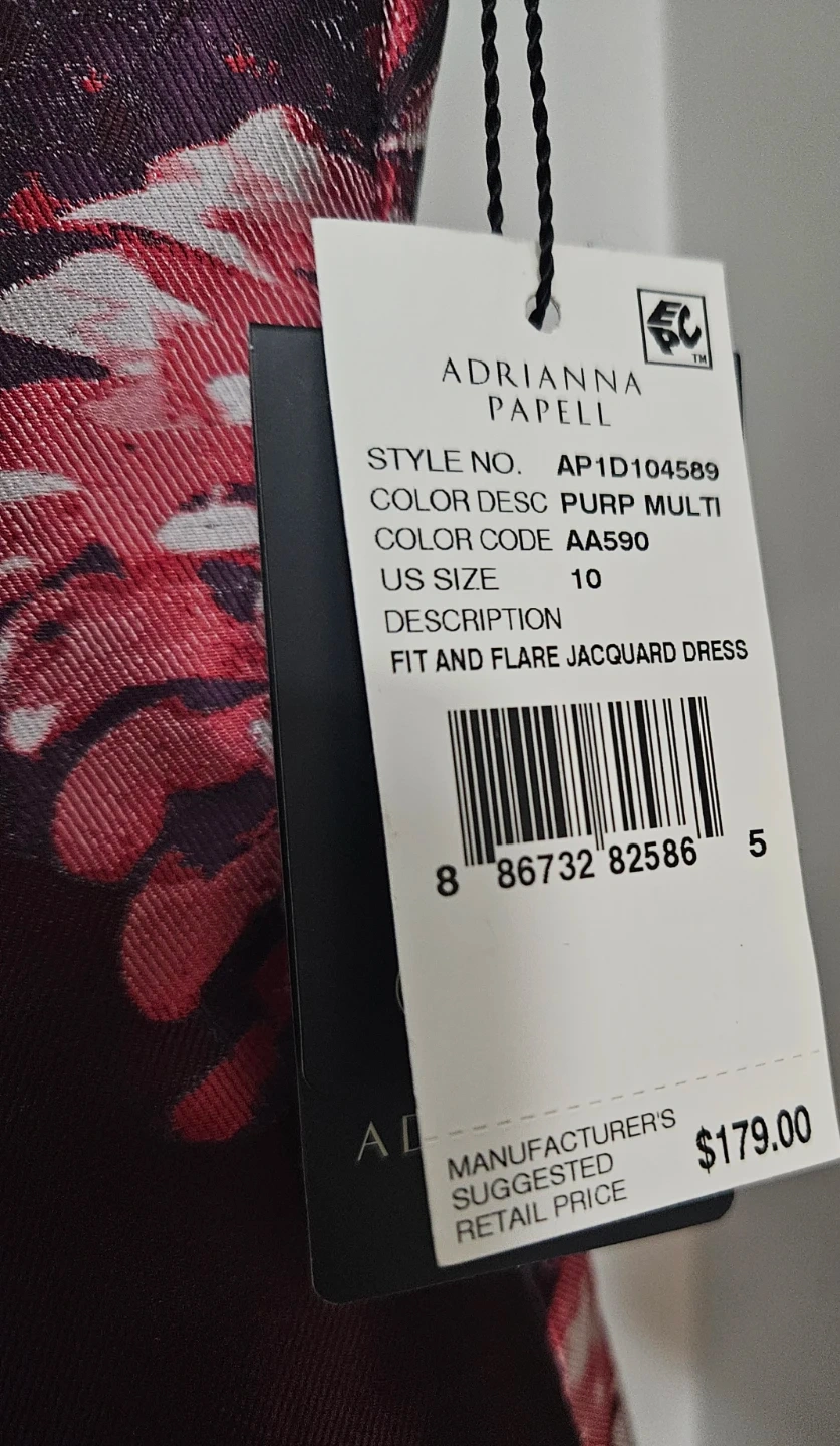 Selling a beautiful Adrianna Papell fit and flare jacquard dress! The dress is a size 10 and features a purple multi colour. The style number is AP1D104589 and the colour code is AA590. Retails for $179.00
