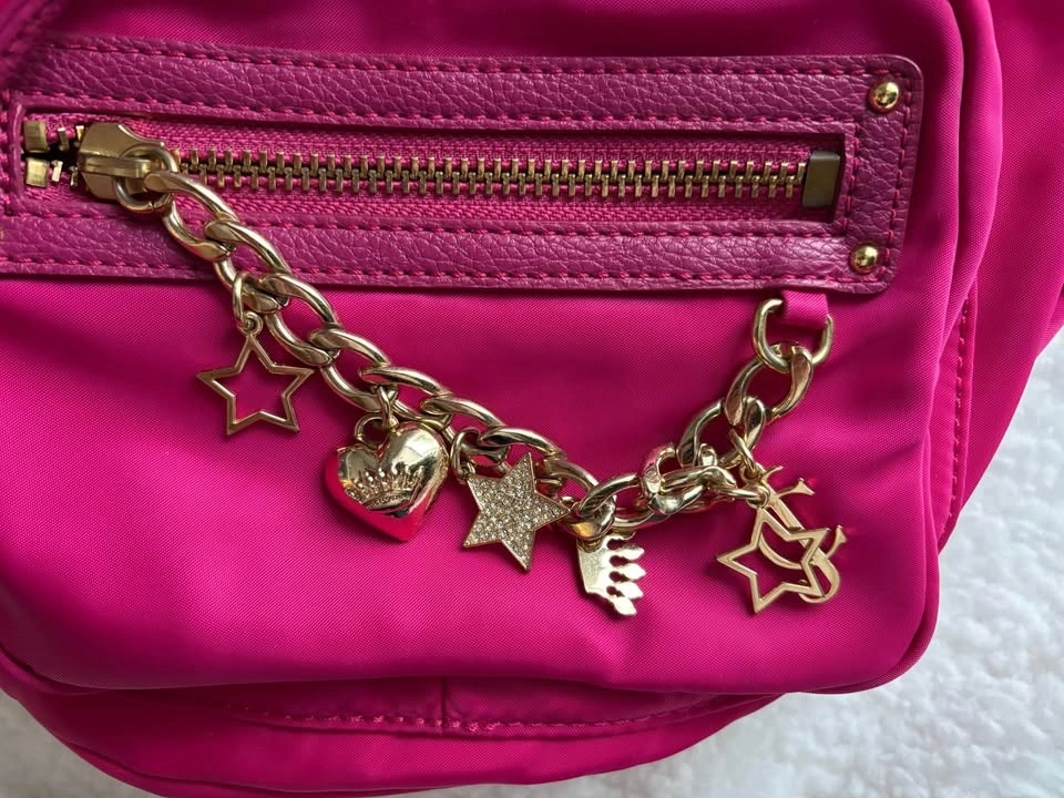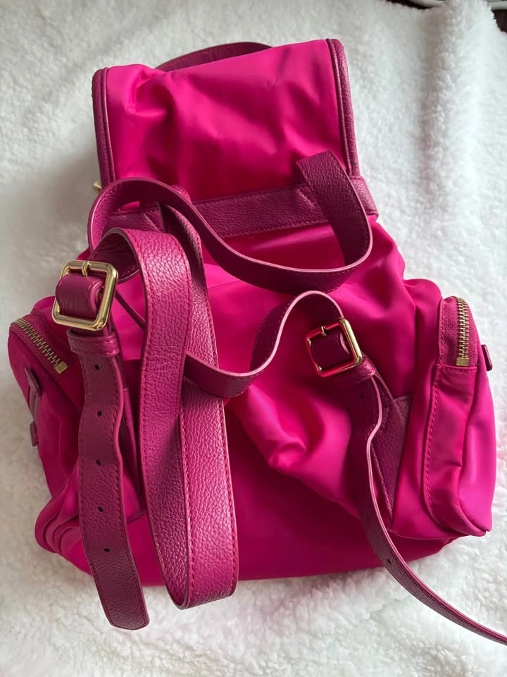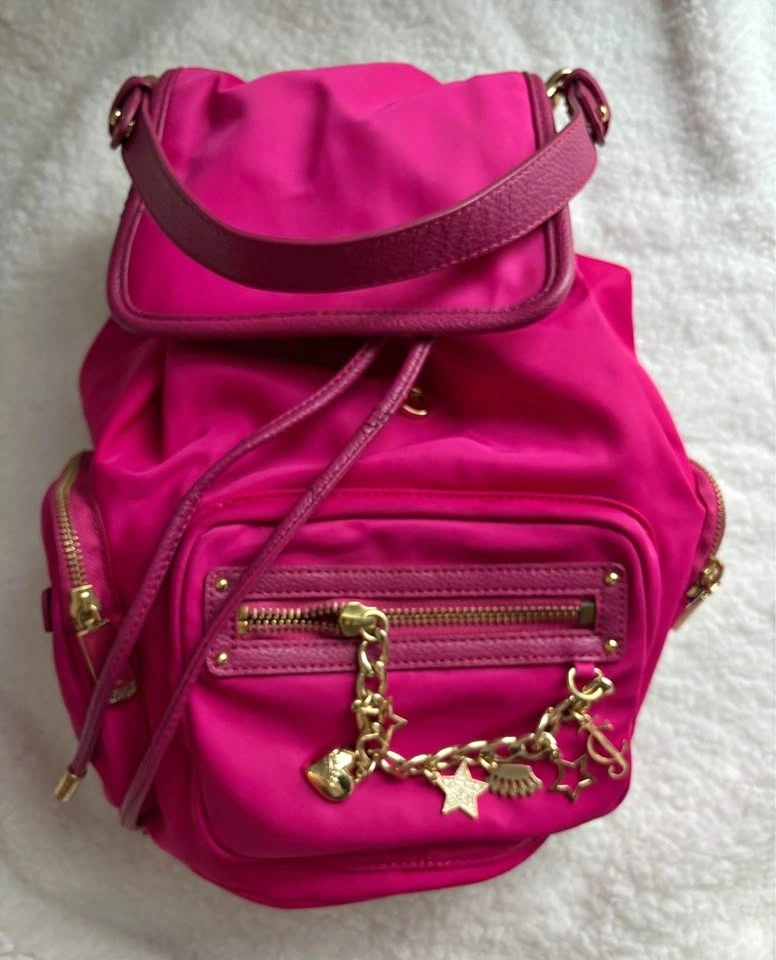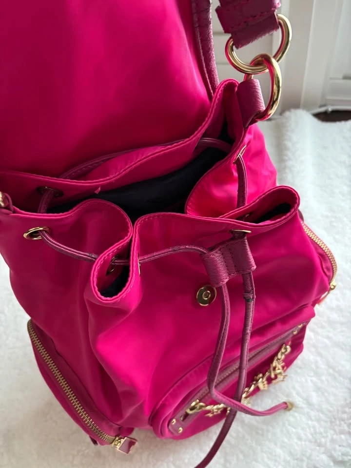Vintage Y2K hot pink nylon backpack with gold-tone hardware and signature brand charms. In good condition with minimal signs of wear. Pick up near 16th and 9th line.