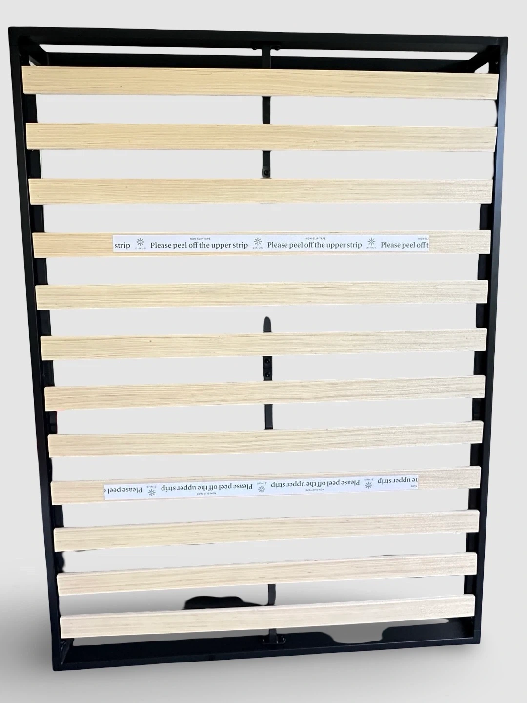 This is a Zinus metal bed frame with wooden slats. It includes non-slip tape on the slats to keep your mattress in place. Assembly is straightforward with easy-to-follow instructions.