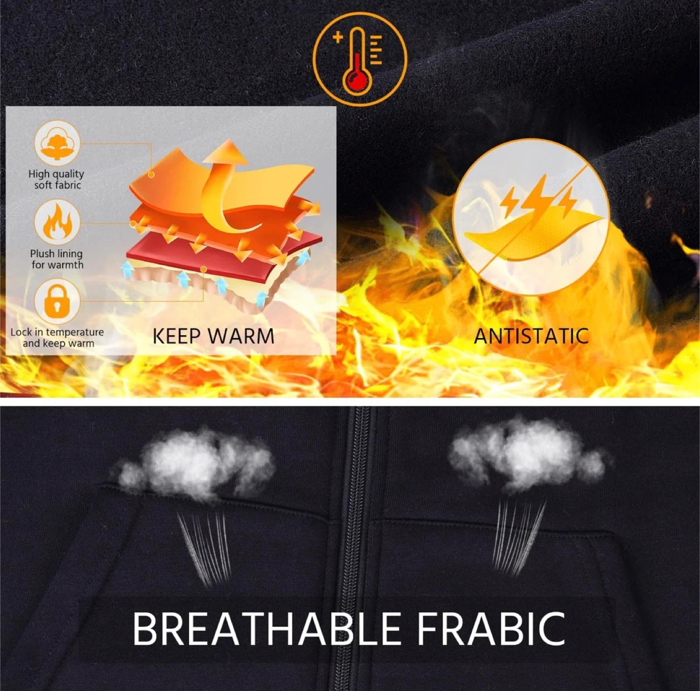 Cozy black zip-up hoodie, perfect for layering! It's a double-layer hoodie with a utility pocket and a double zipper. The material is breathable and antistatic, plus it has a plush lining for warmth. Stay comfy and stylish!