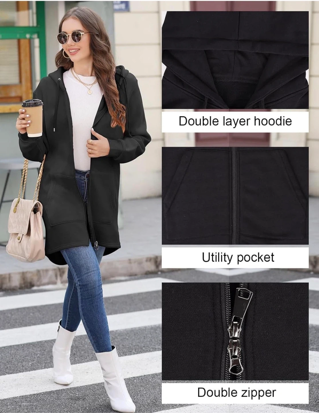 Cozy black zip-up hoodie, perfect for layering! It's a double-layer hoodie with a utility pocket and a double zipper. The material is breathable and antistatic, plus it has a plush lining for warmth. Stay comfy and stylish!