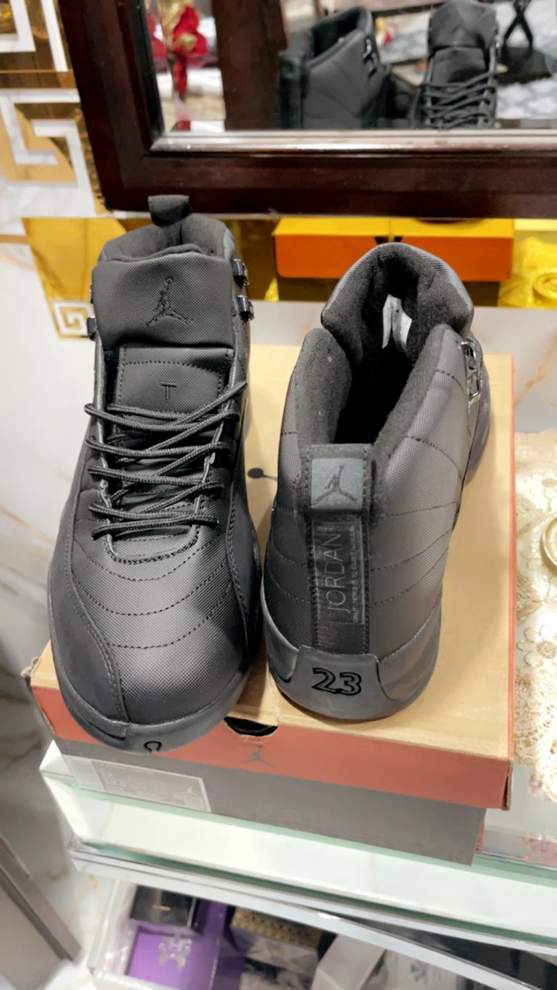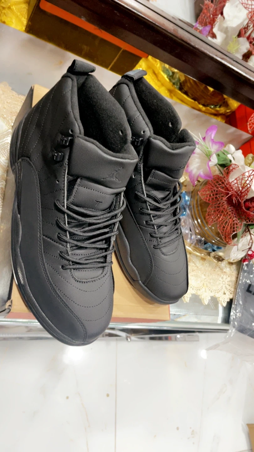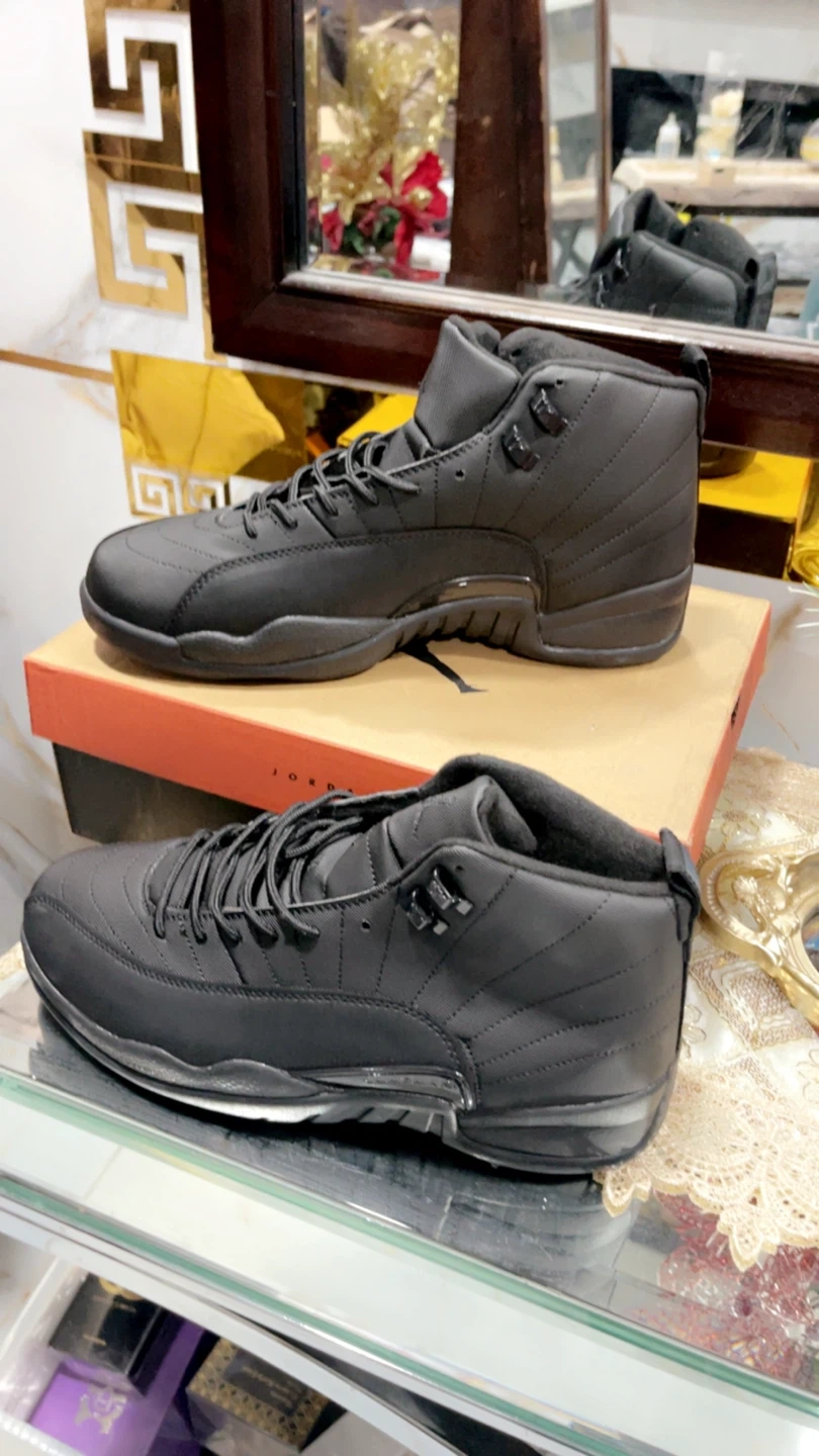 These are black Air Jordan 12 Retro sneakers. They feature a high-top design with laces and the Jordan logo. Comes with the original box. Size 10, 11, 12