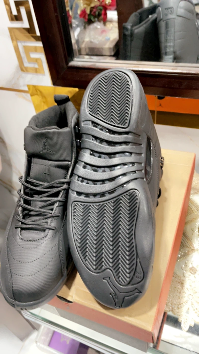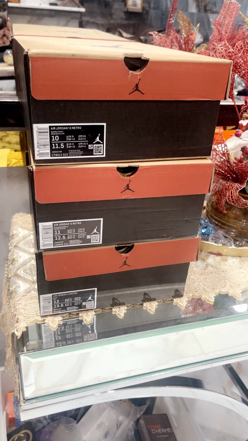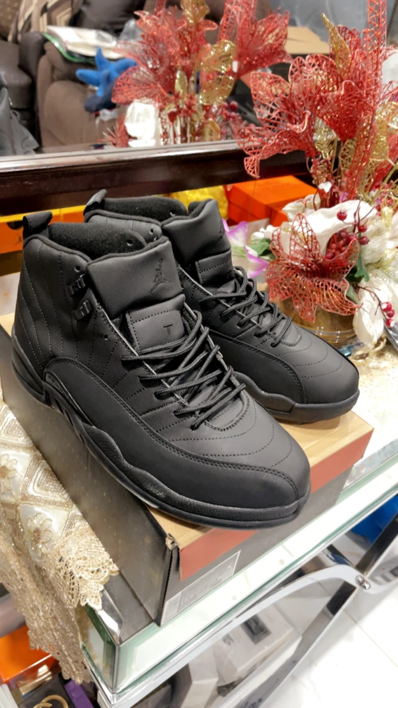 These are black Air Jordan 12 Retro sneakers. They feature a high-top design with laces and the Jordan logo. Comes with the original box. Size 10, 11, 12