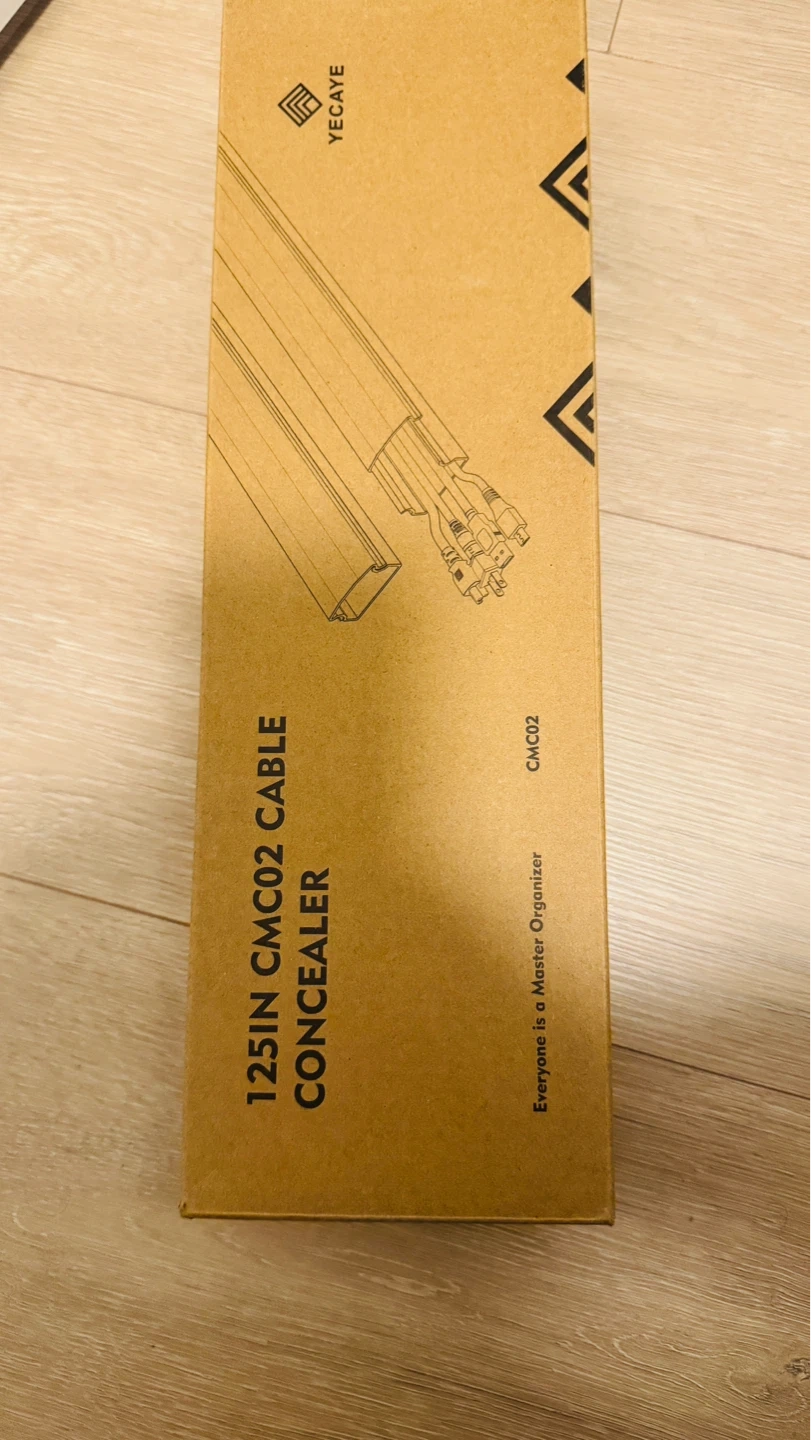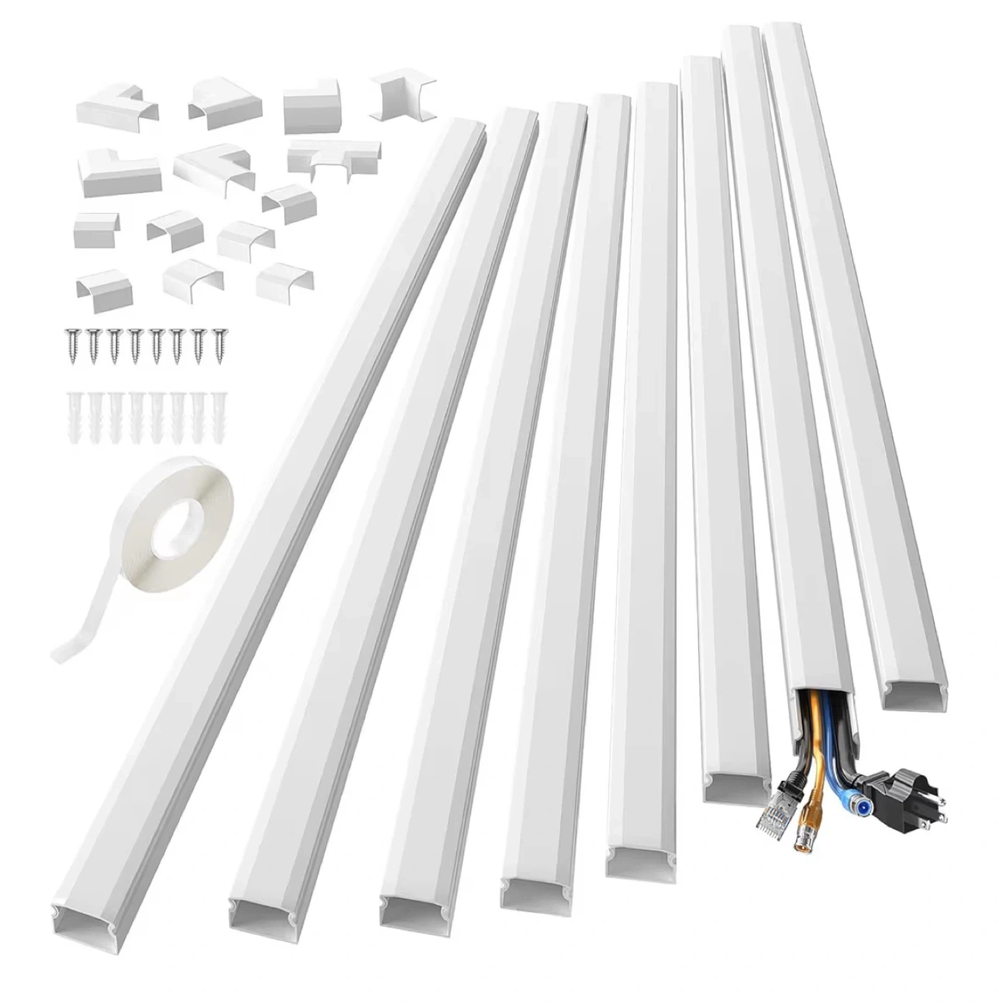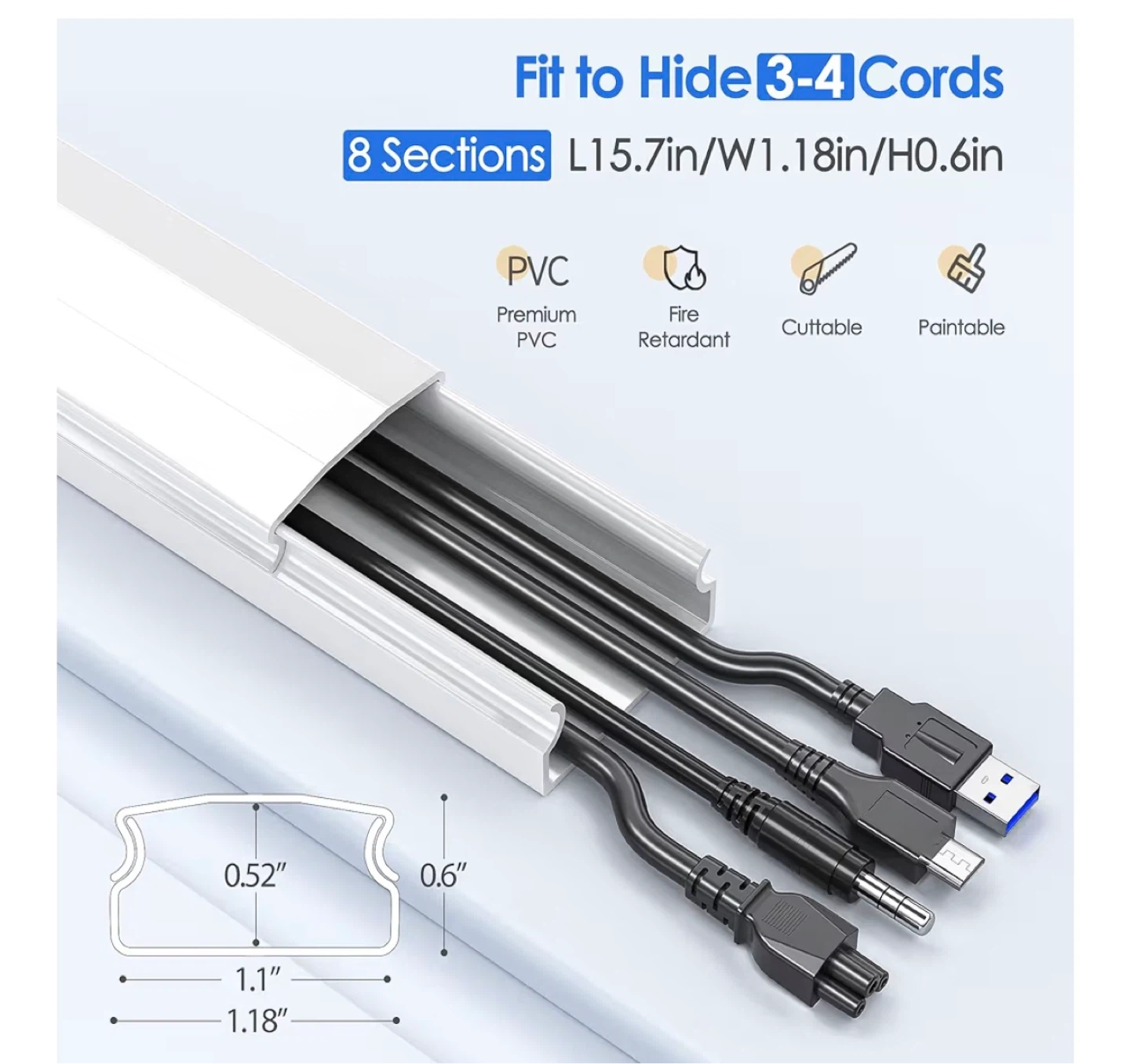 This is a Yecaye cable concealer kit designed to hide 3-4 cords. It's made of premium PVC, fire retardant, cuttable, and paintable. The kit includes various connectors for different cable turns and mounting hardware.