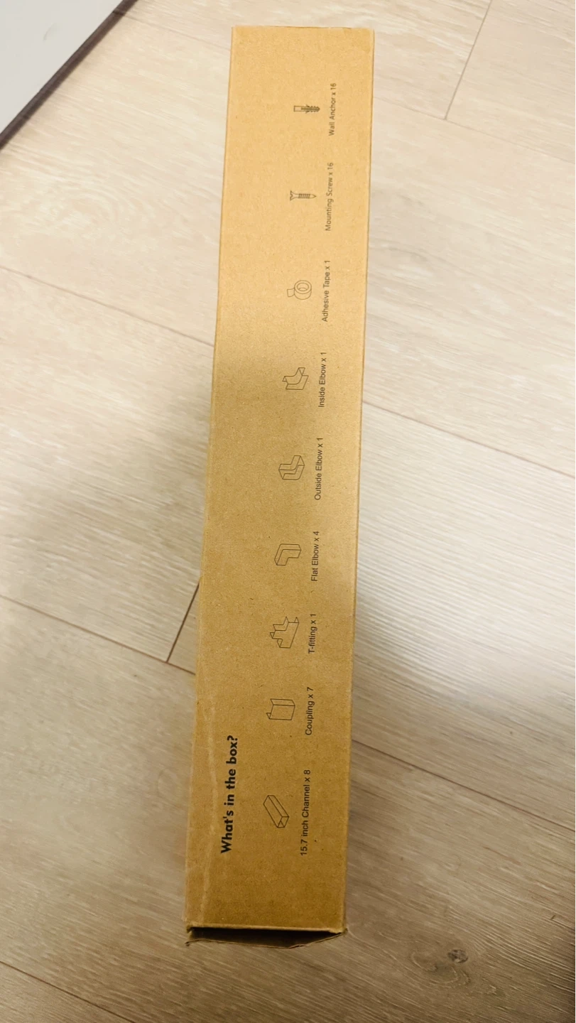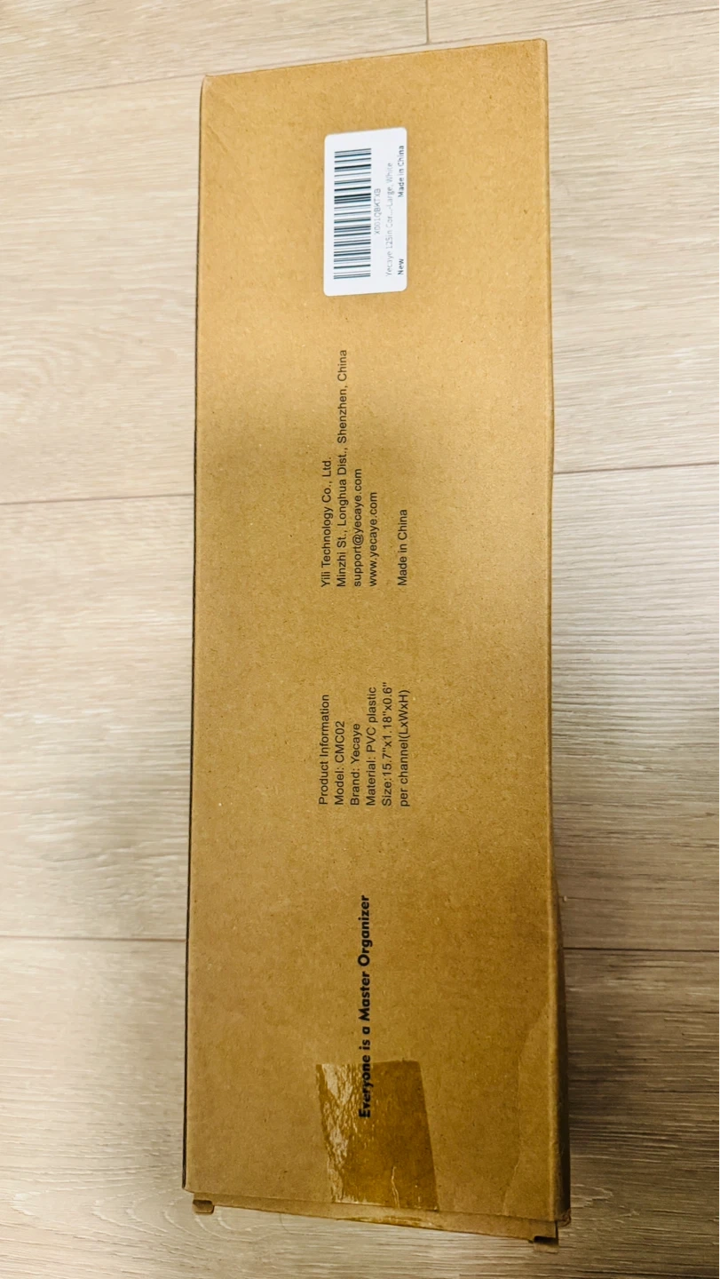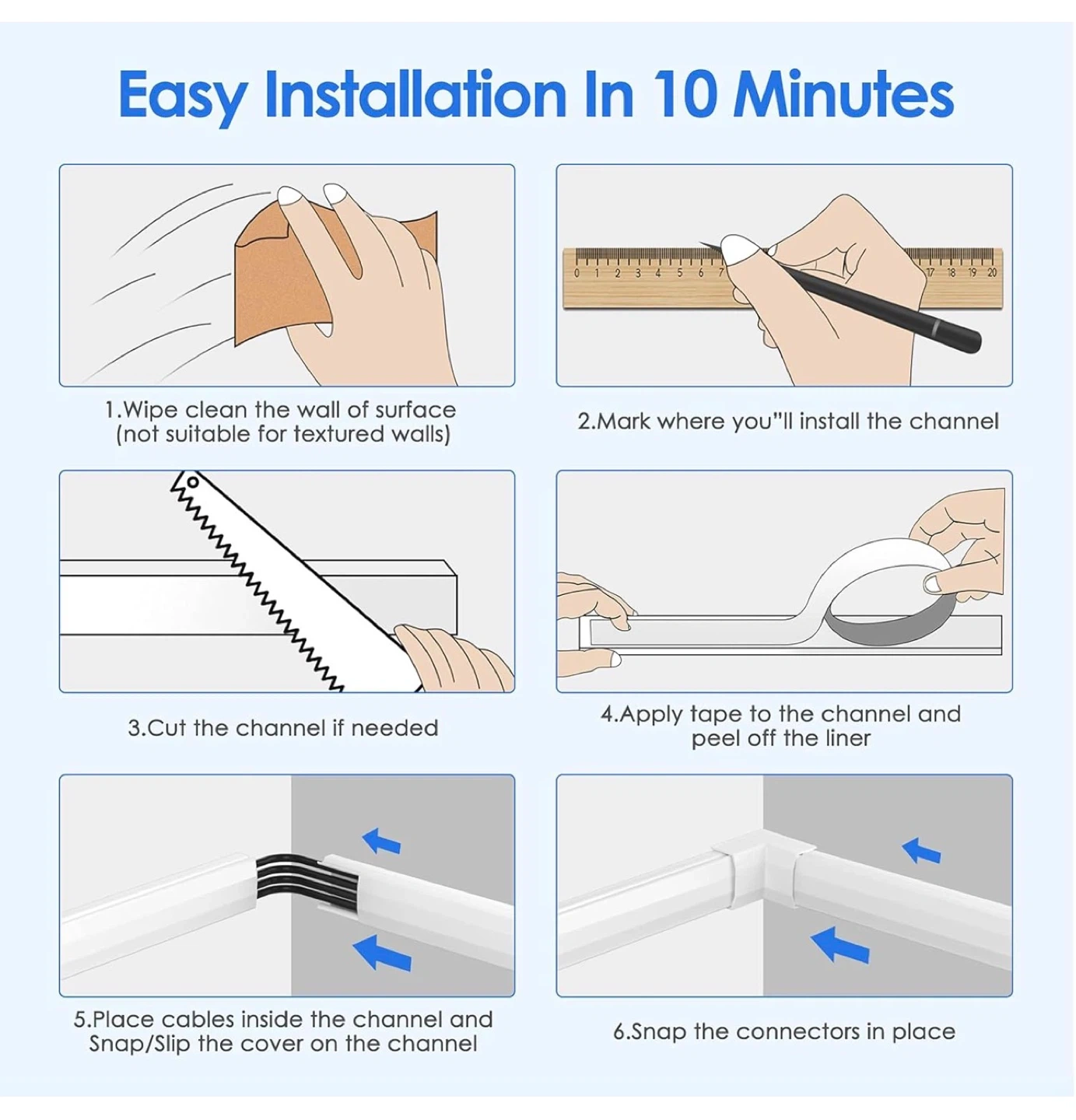 This is a Yecaye cable concealer kit designed to hide 3-4 cords. It's made of premium PVC, fire retardant, cuttable, and paintable. The kit includes various connectors for different cable turns and mounting hardware.