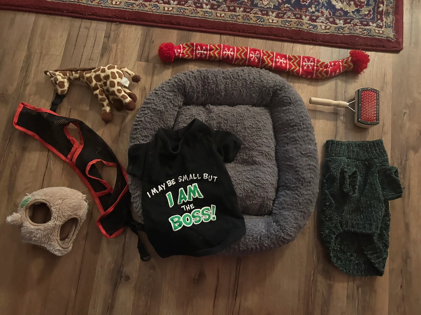 a bundle of dog items! Includes a cozy grey dog bed, a cute "I May Be Small But I Am The Boss!" t-shirt, a green sweater, a giraffe toy, a red/white toy, a brush, a black/red harness, and a plushy mask. Everything is in great condition and ready for a new furry friend to enjoy
