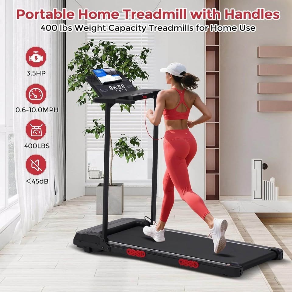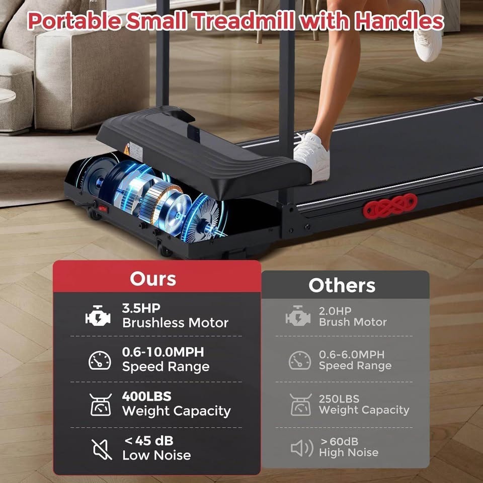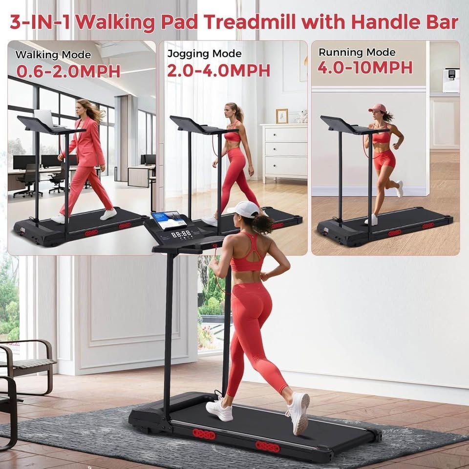 This home walking pad with handle bar has a compact, space-saving design, paired with sturdy handles for stability and safety. Three modes support speeds 0.6-10mph, meeting varied needs. Ideal for apartments or offices, this portable treadmill with handles is a great option. It features a large high-definition LED display that clearly shows time, speed, distance, and calories burned. The walking pad surface provides ample space for comfortable movement. The 3.5HP motor runs smoothly and quietly, hitting 10mph max with under 45dB noise. It has a 400lb capacity and a 6-layer shock belt to ease joint stress and cut workout noise. Engineered for sustained home fitness, this walking pad treadmill with handles merges portability with robustness.
