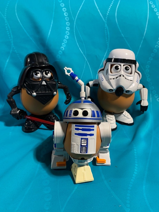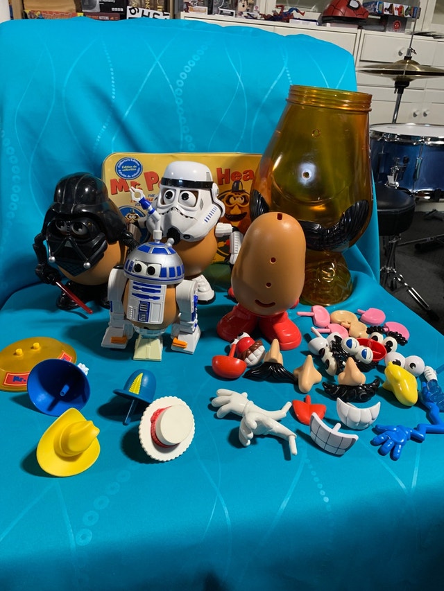 Nice large lot of vintage Mr Potato Heads and accessories. Includes Darth Vader, Stormtrooper, R2D2 Star Wars figures. Also includes another body with lots of parts and large body shaped container (broken at bottom and missing the top). Also have the tin lid to a vintage set. Feel free to message if you have any questions!