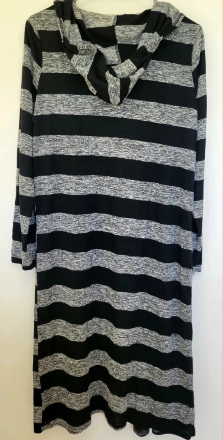 This Majora hooded cardigan features a black and grey stripe pattern. It's a size L/G and made in Bangladesh. It's an open-front design with long sleeves.