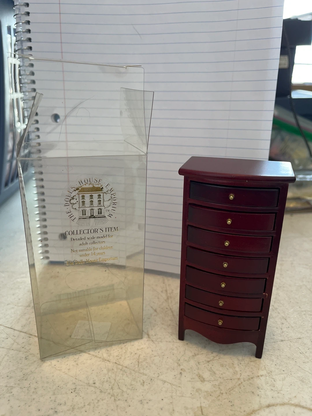 This is a detailed scale model of a dresser, perfect for adult collectors or dollhouse enthusiasts. It's a beautiful cherry wood finish with brass knobs on seven drawers. This item is not a toy and is intended for ages 14 and up.1/12 scale in original package