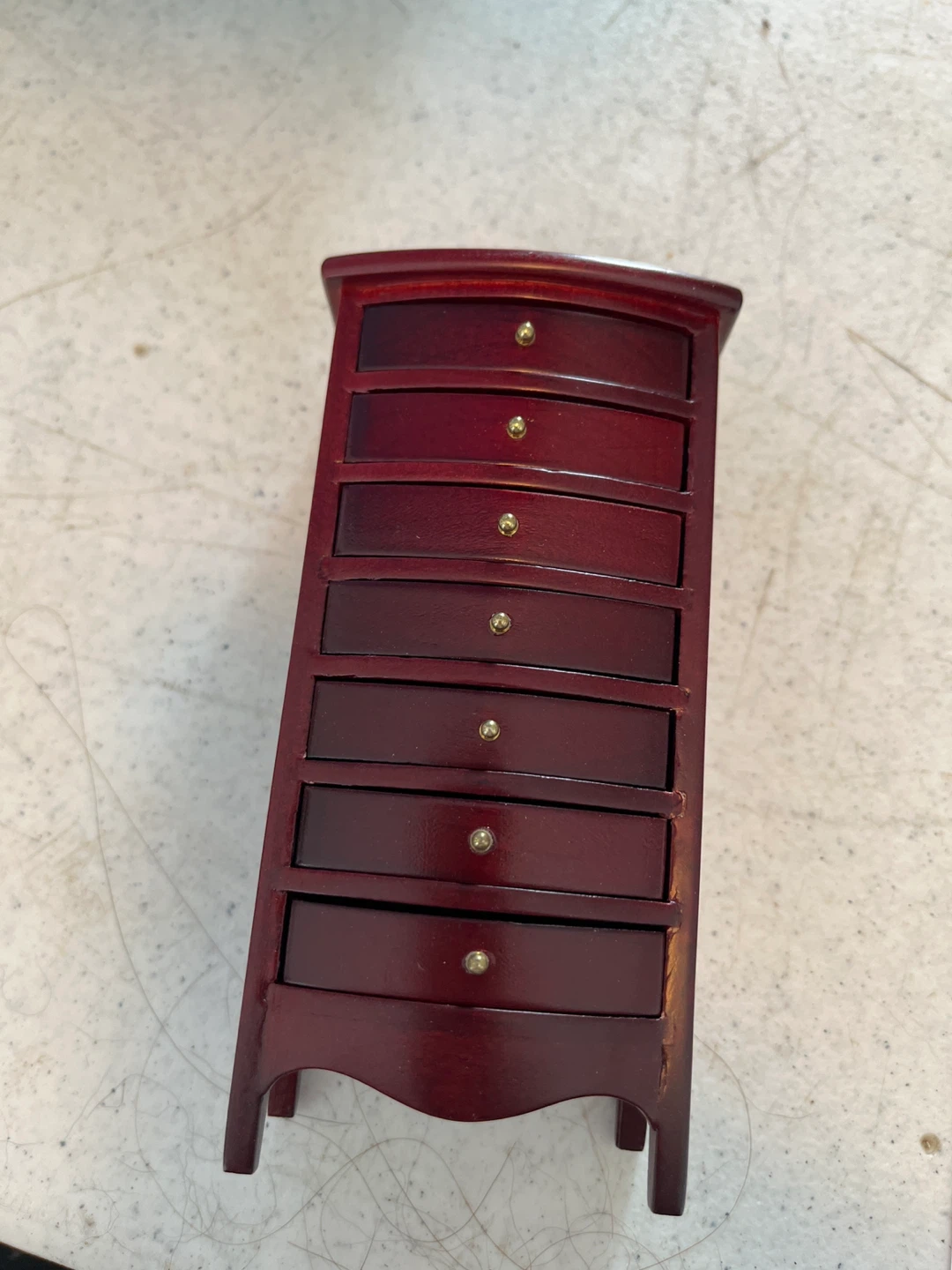 This is a detailed scale model of a dresser, perfect for adult collectors or dollhouse enthusiasts. It's a beautiful cherry wood finish with brass knobs on seven drawers. This item is not a toy and is intended for ages 14 and up.1/12 scale in original package