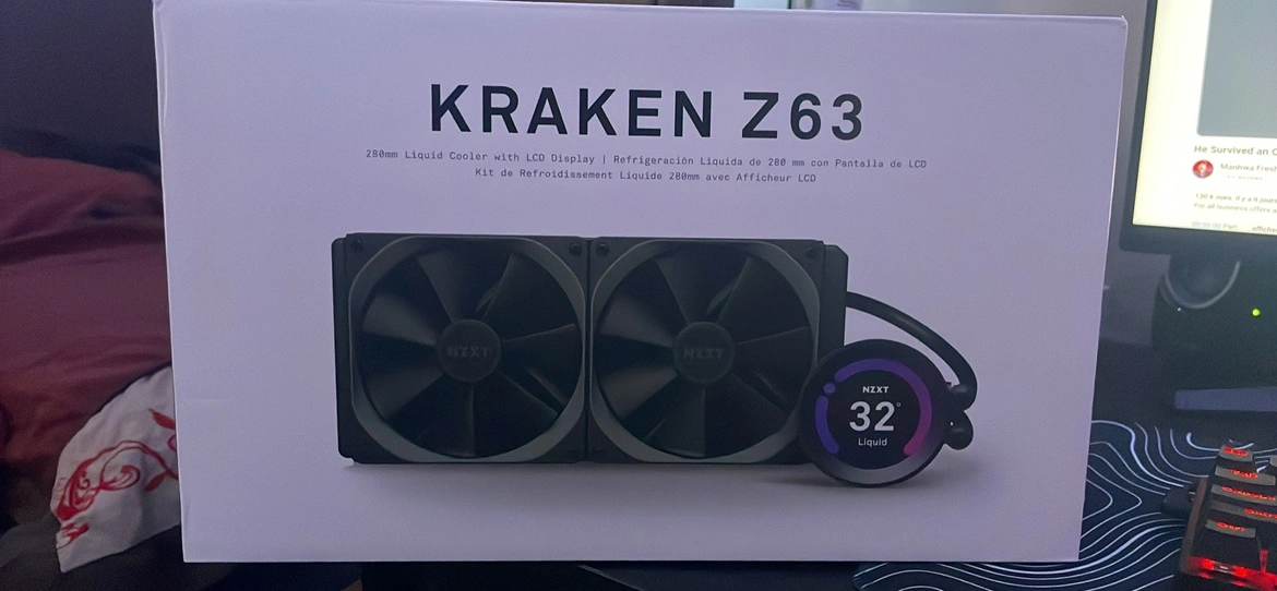 This is a NZXT Kraken Z63 CPU cooler with an LCD display. The cooler comes with the original packaging. It is in good condition and has been used for a short period. It can be used with Intel and AMD CPUs.