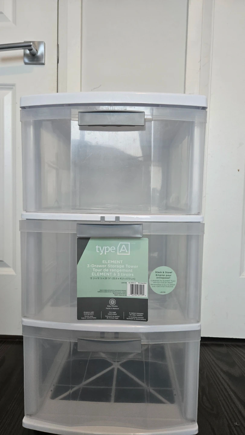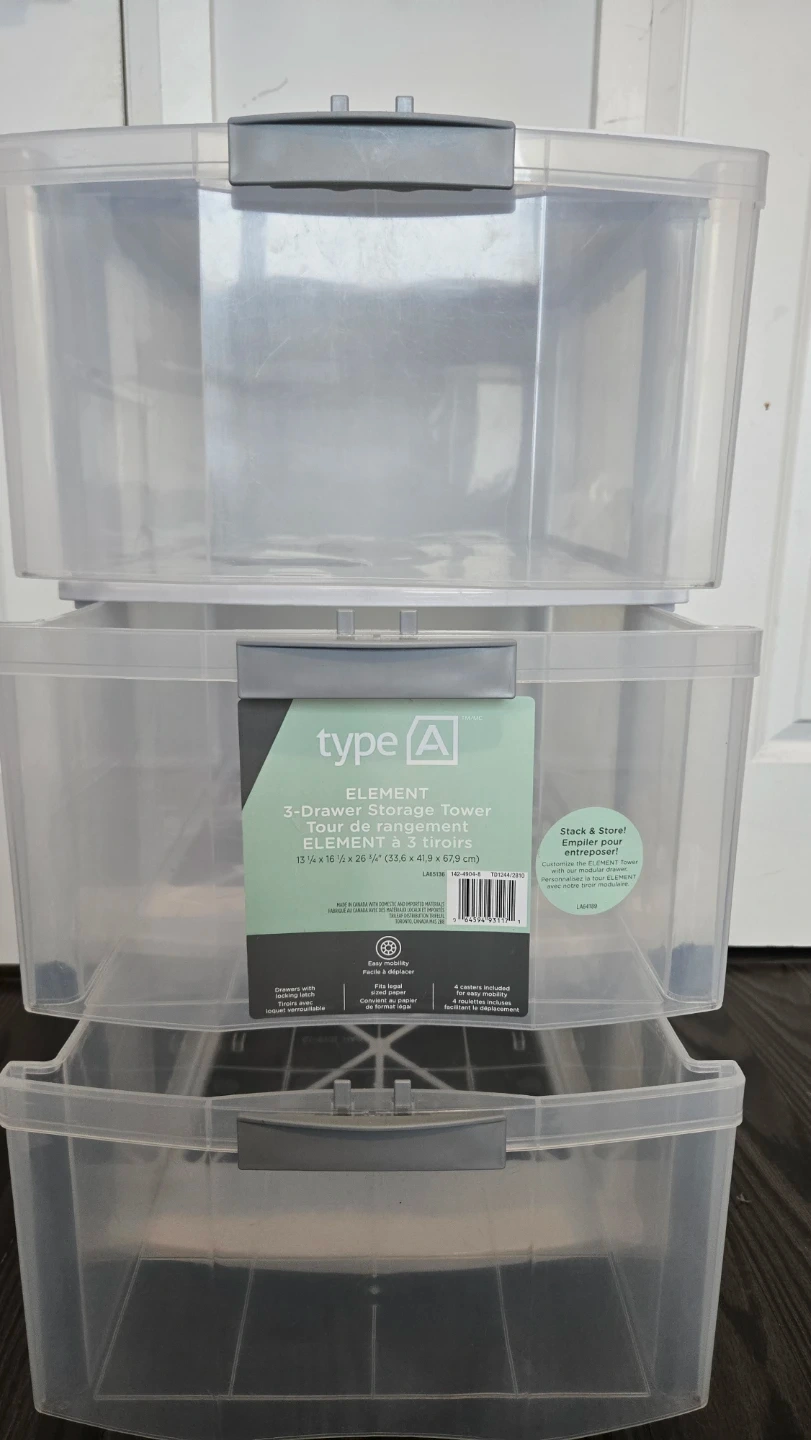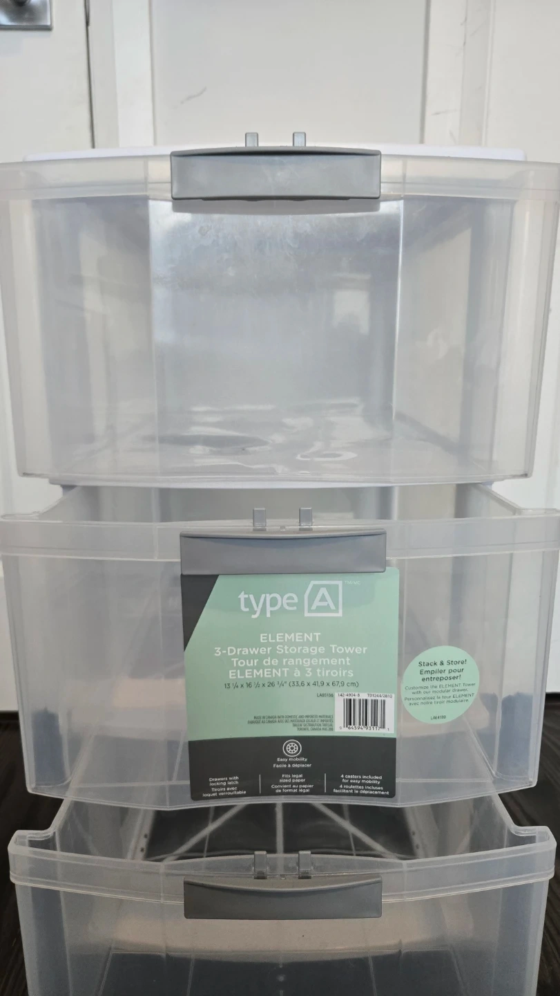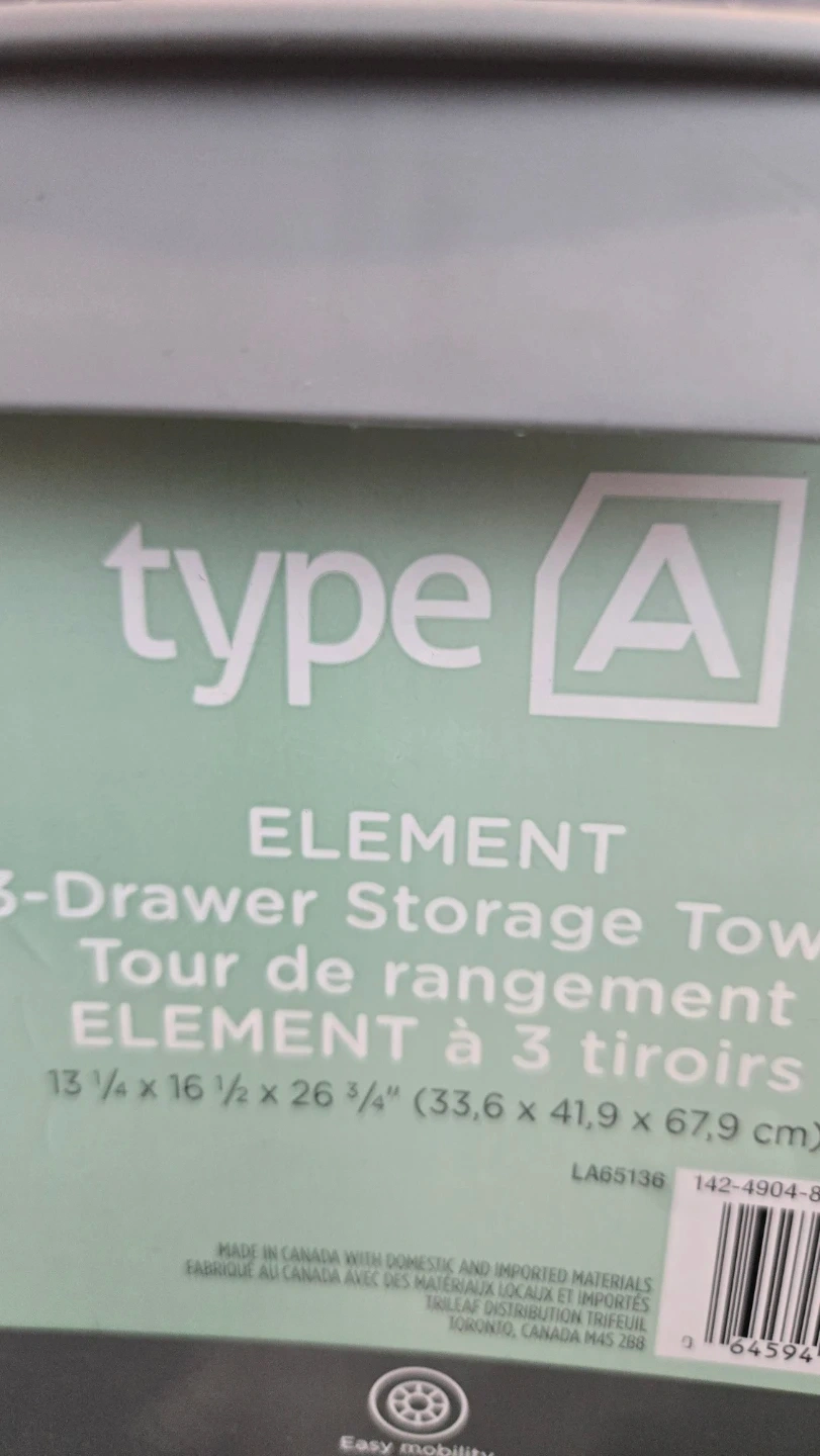 This is a type A ELEMENT 3-drawer storage tower. It's made in Canada with domestic and imported materials. The drawers stack and store easily. It's great for organizing craft supplies or office essentials!