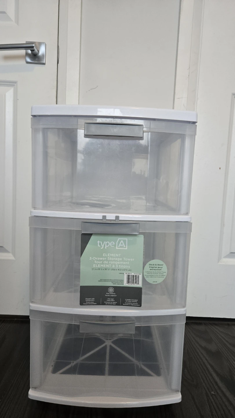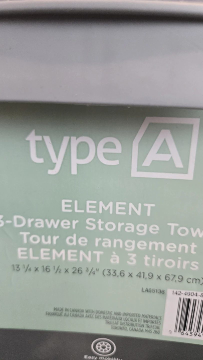 This is a type A ELEMENT 3-drawer storage tower. It's made in Canada with domestic and imported materials. The drawers stack and store easily. It's great for organizing craft supplies or office essentials!
