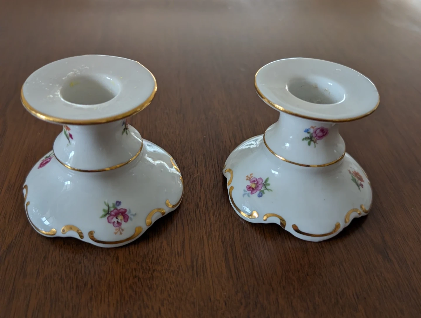 White porcelain vintage Graf von Henneberg candlesticks featuring a delicate floral pattern and gold trim. These hold standard taper candles. They're great for adding a touch of elegance to any tablescape!